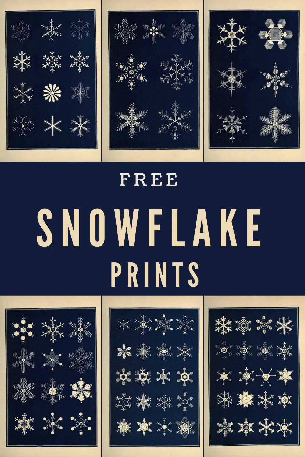 The vintage snowflake illustrations are from “Snowflakes: a chapter from the book of nature” by Warren, Israel Perkins, 1863. They are in the Public Domain, so they are copyright free.