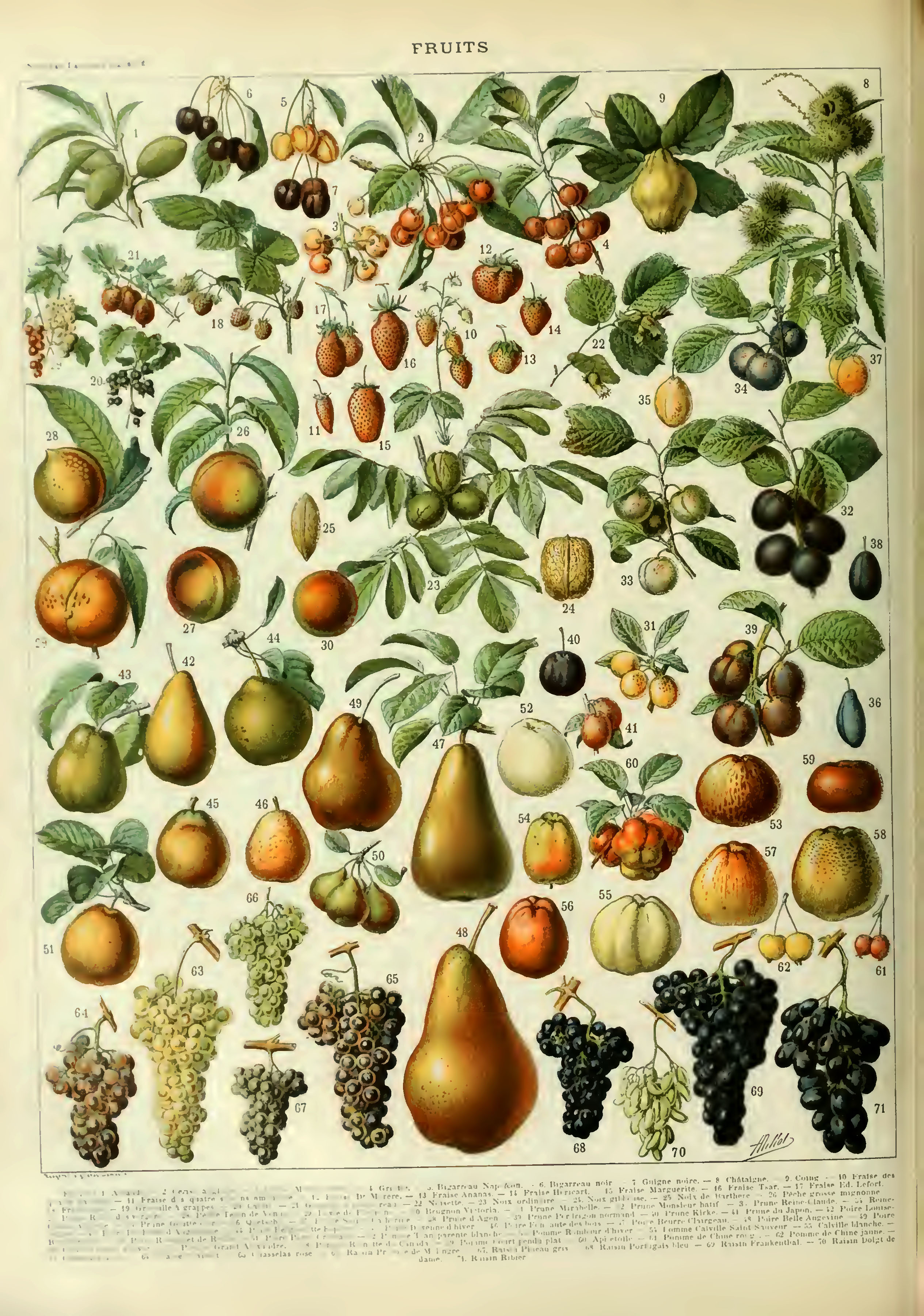 This first vintage fruit identification poster of Adolphe Millot features 71 different labelled fruits, from almonds to grapes. A key is at the bottom of the poster.
