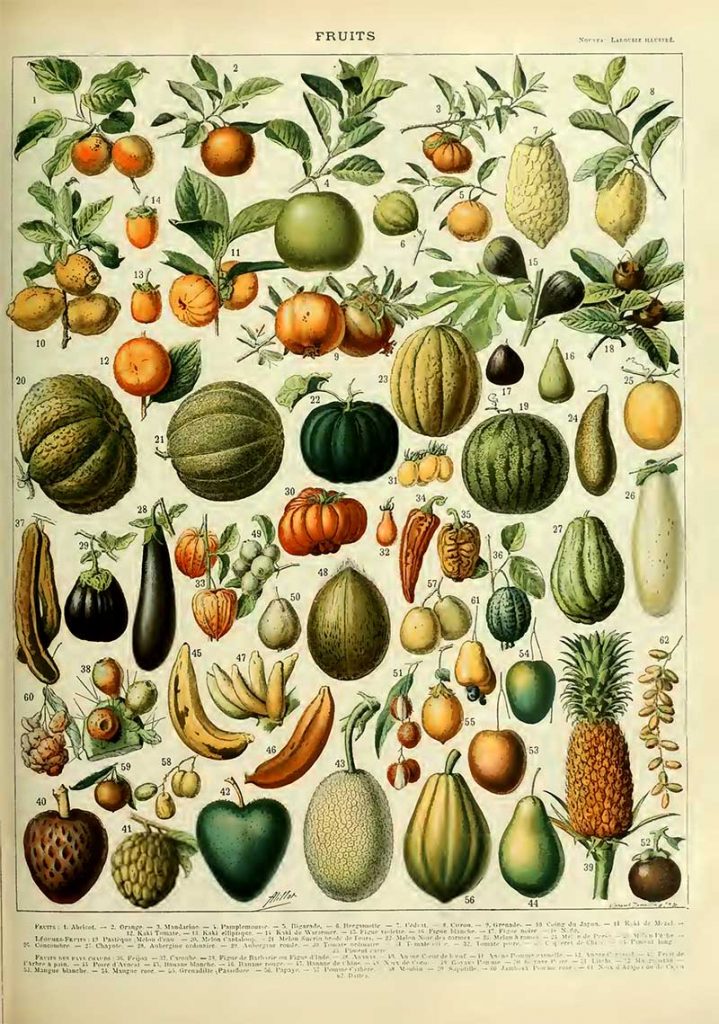 This vintage poster of Adolphe Millot includes a greater variety of fruits. Interestingly, the poster includes aubergines (eggplants), tomatoes, and peppers, which are often mistaken for vegetables.