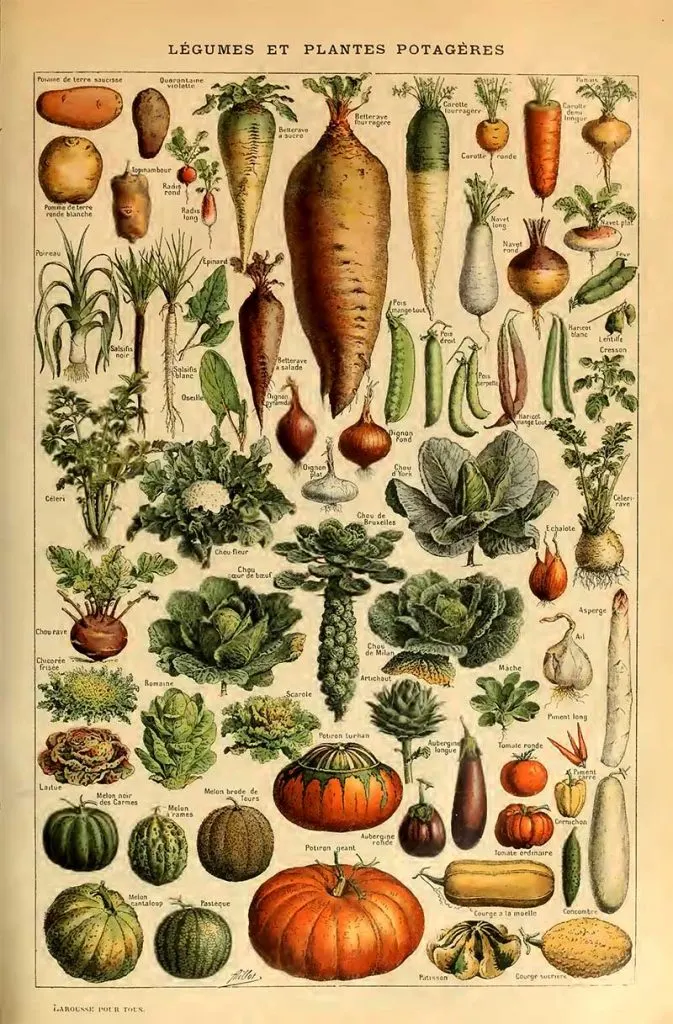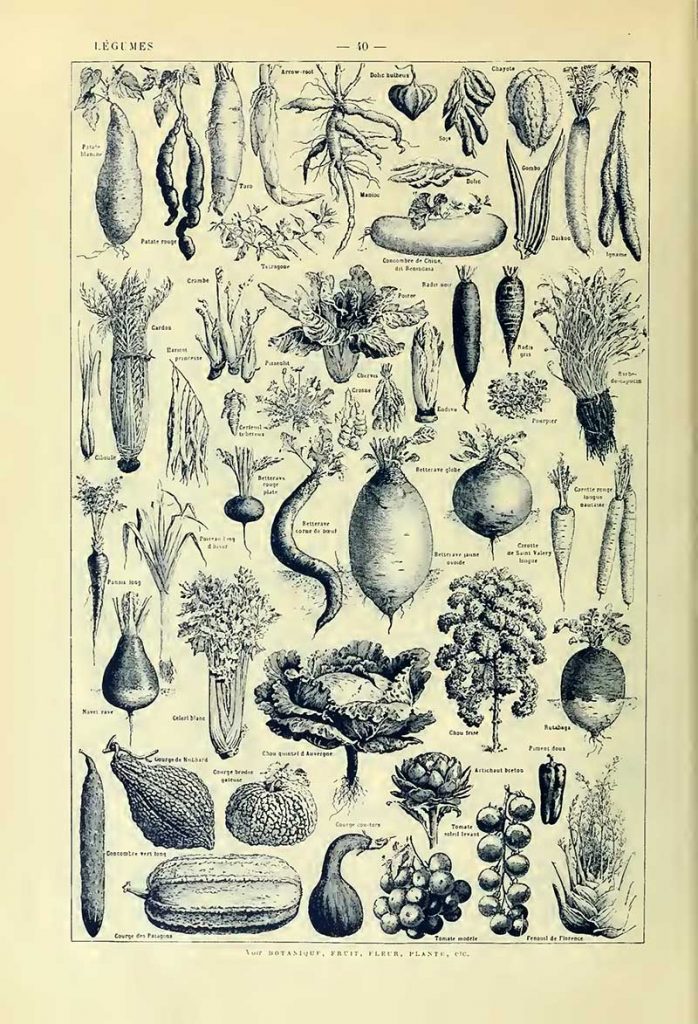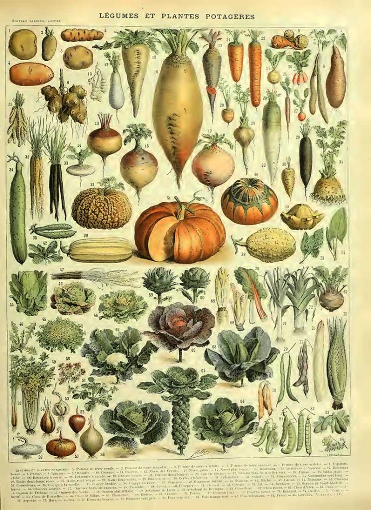 The title of this vegetable print “Legumes et plantes potageres” translates as “vegetables and vegetable plants“.