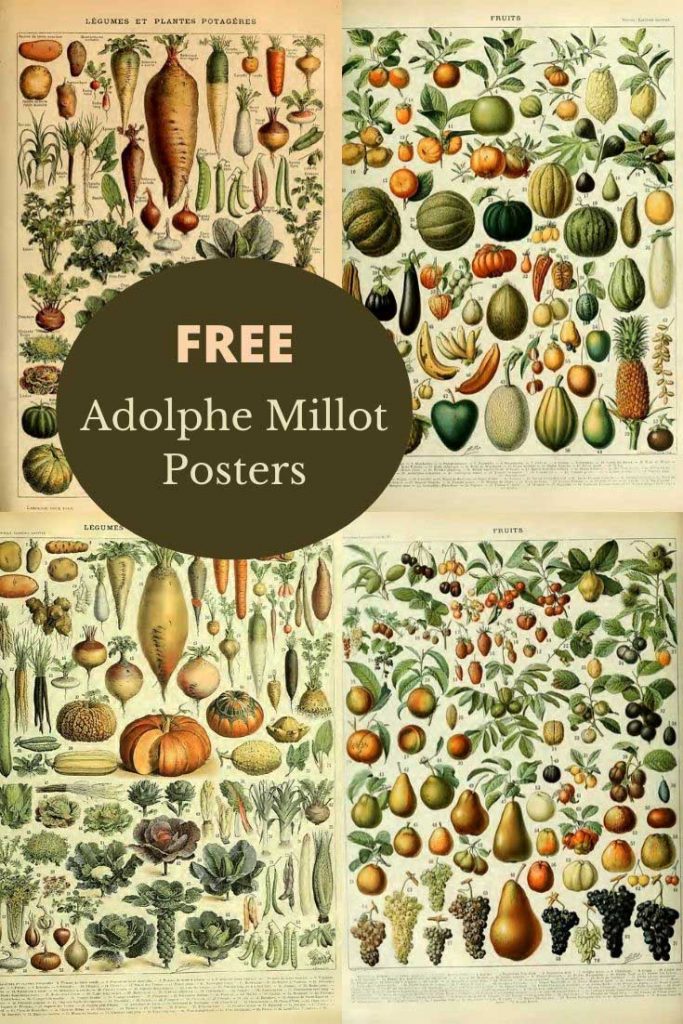 I have featured the antique botanical posters of Adolphe Millot which just focused on his floral and fungi charts. This collection focuses just on his vintage fruit and vegetable prints. All these Adolphe Millot posters are in the public domain so you are free to use them as you wish.