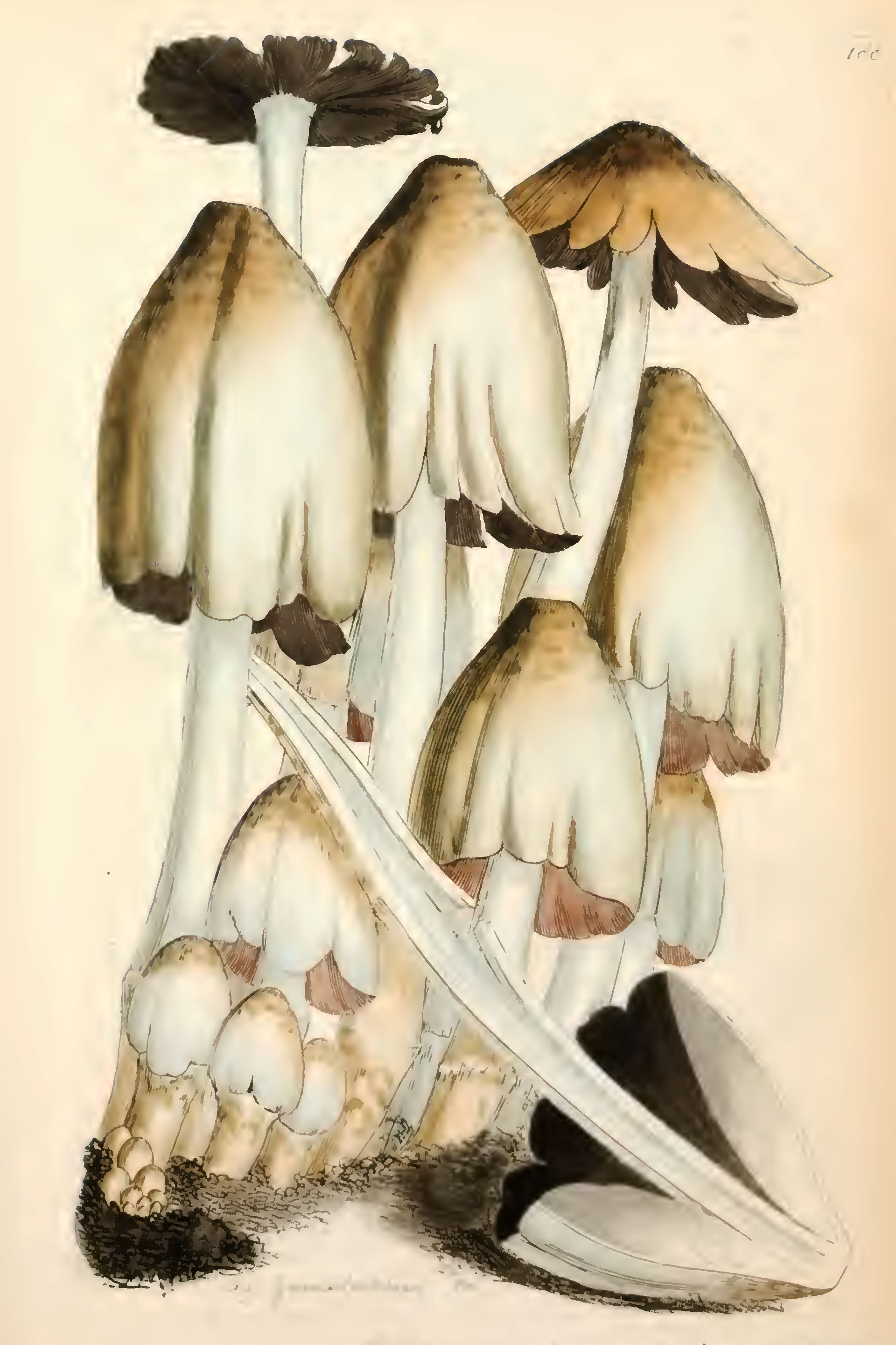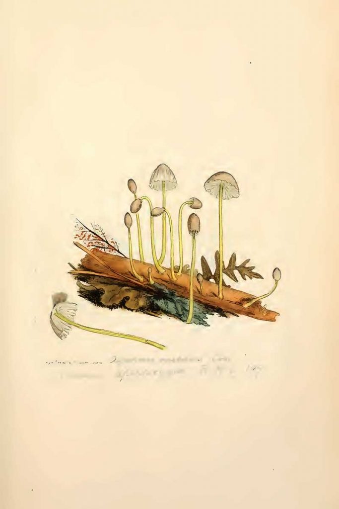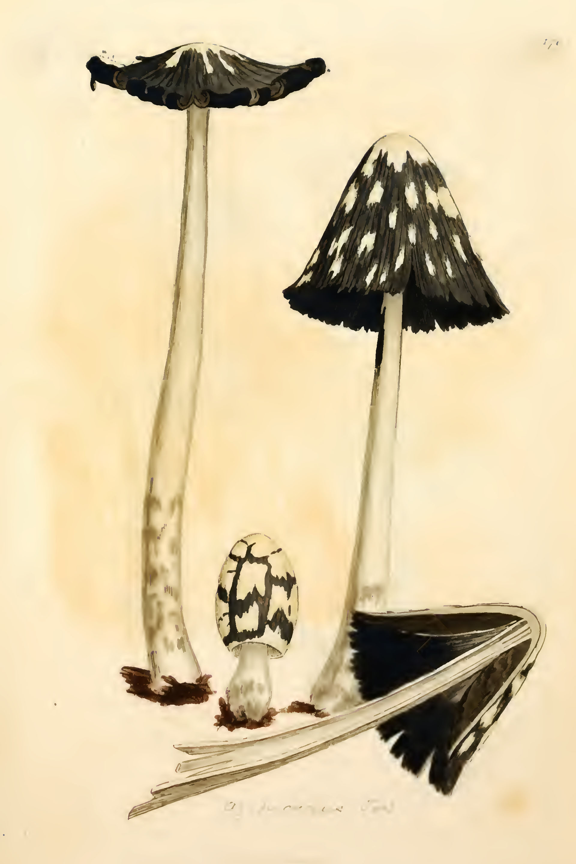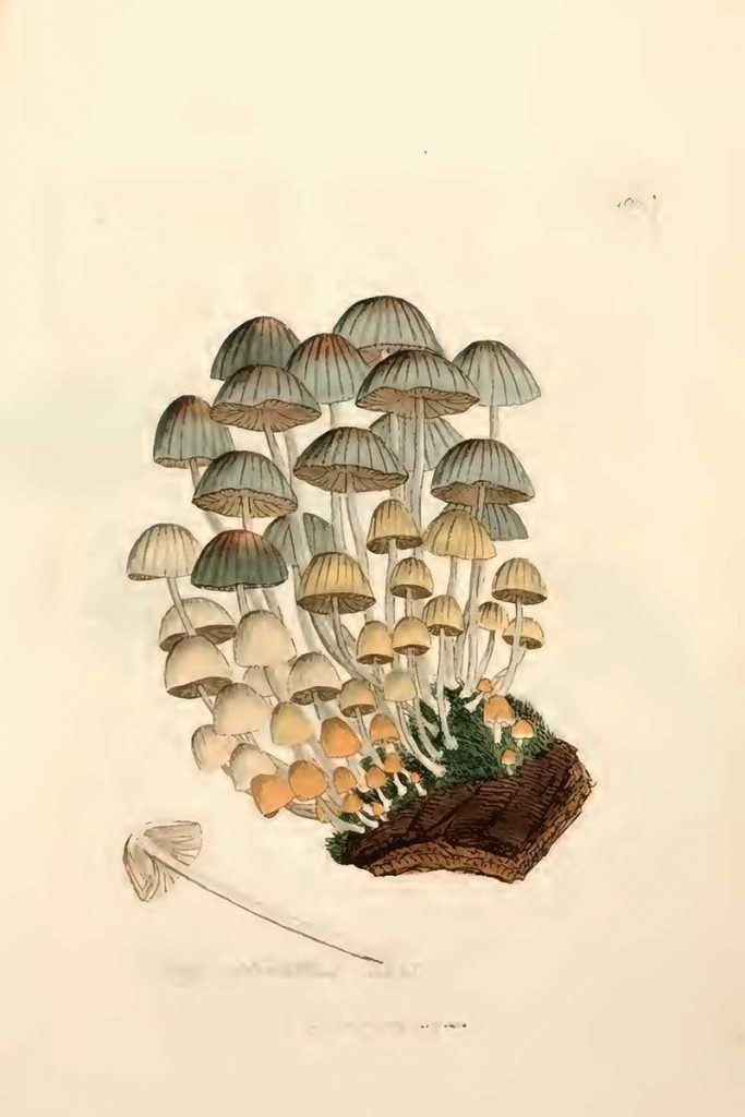 The mushroom drawings are more commonly known as “fairy inkcap“. Unlike most other coprinoid mushrooms, these do not dissolve into black ink (deliquesce) in maturity. The mushroom is edible but of low quality.