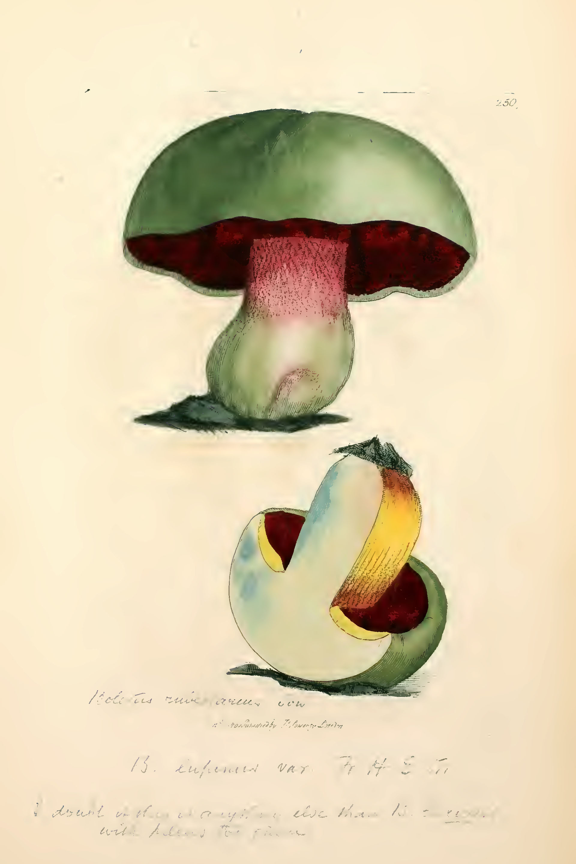This fungus is commonly known as the lurid bolete. It is edible when cooked but not when raw or combined with alcohol.