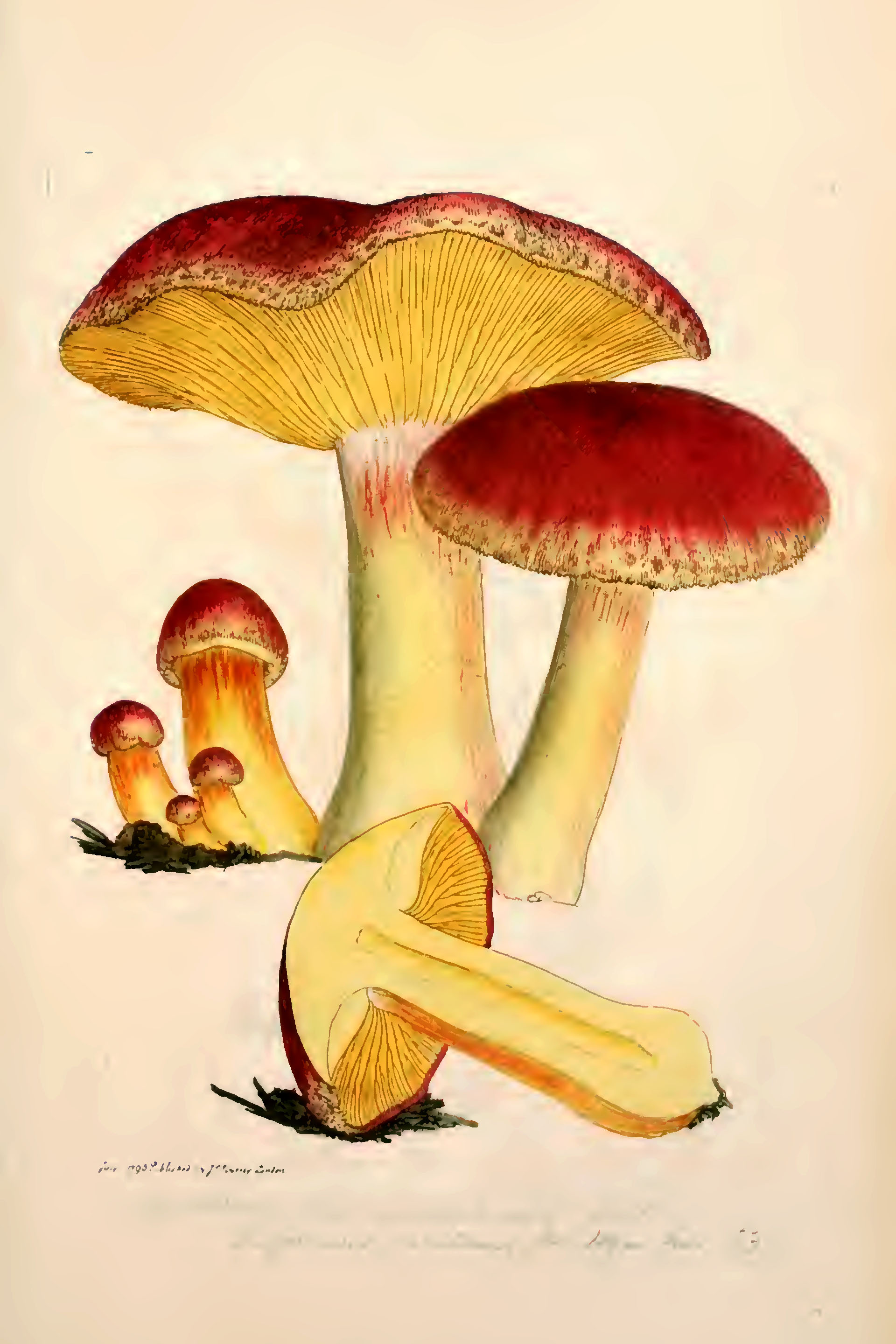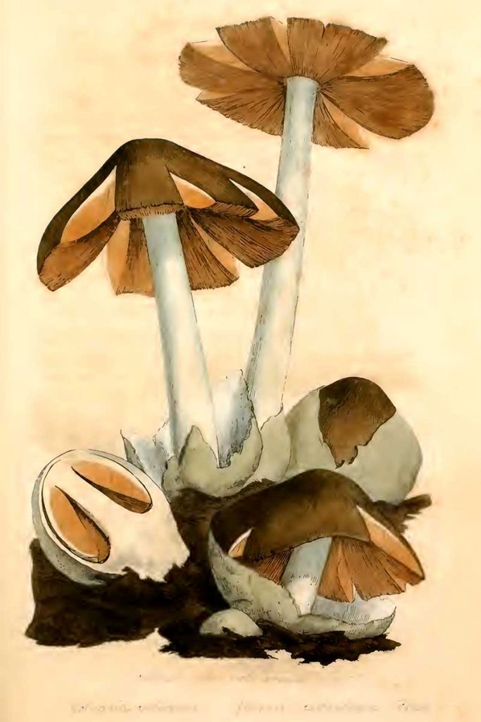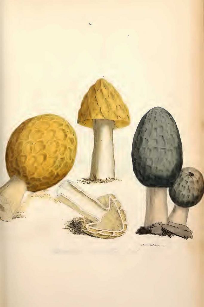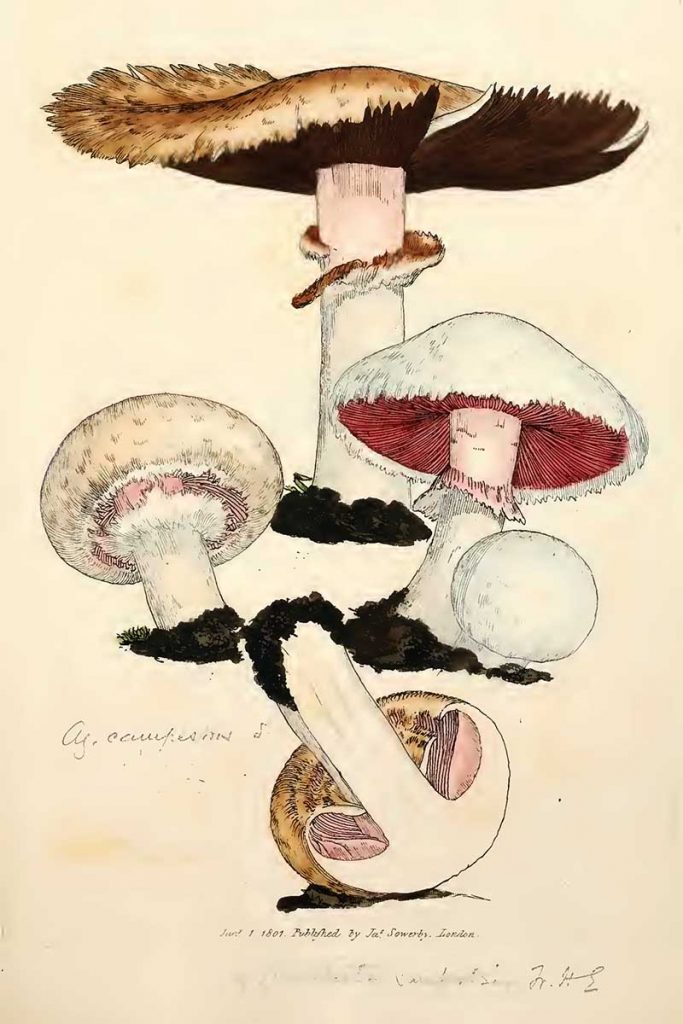 A curated collection of vintage fungi and mushroom drawings from the book “Coloured Figures of English Fungi or Mushrooms” by James Sowerby (1809).