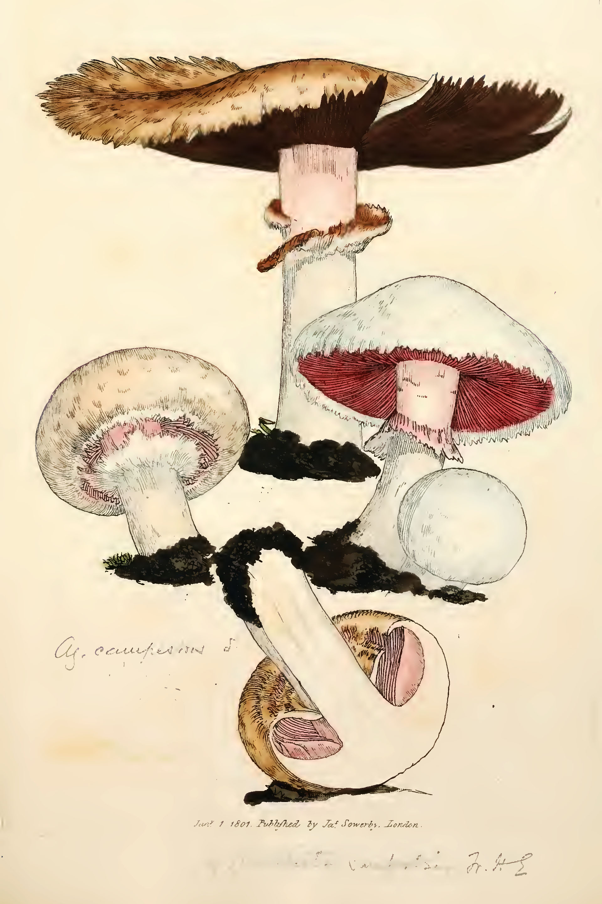 The mushrooms in this drawing are more commonly known as field mushrooms or in the US meadow mushrooms. It is an edible gilled mushroom closely related to the cultivated button mushroom.