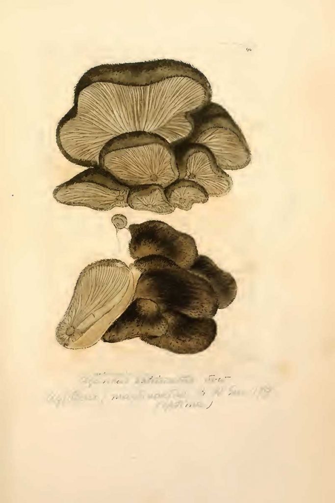 A vintage fungus drawing of Hohenbuehelia mastrucata also more commonly known as the woolly oyster.