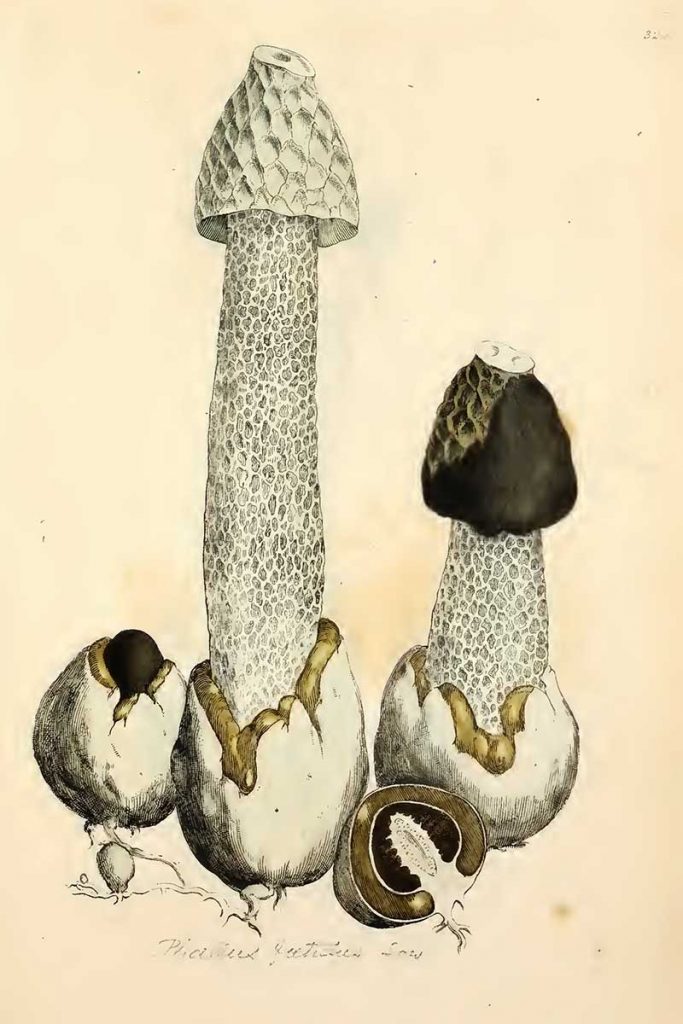 The mushrooms in this drawing are more commonly known as the common stinkhorn. The fungus emits a foul odor and has phallic shape when mature.