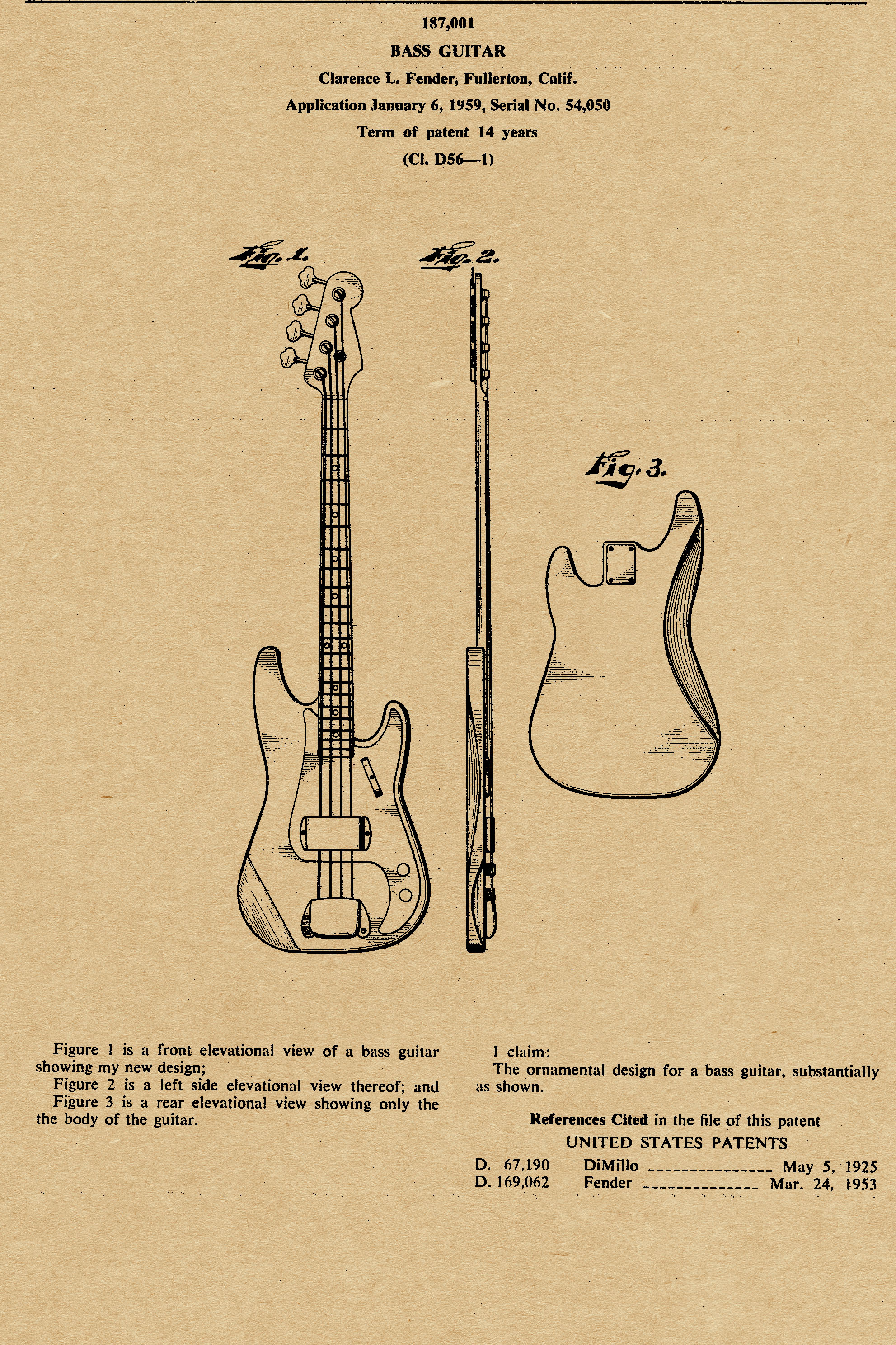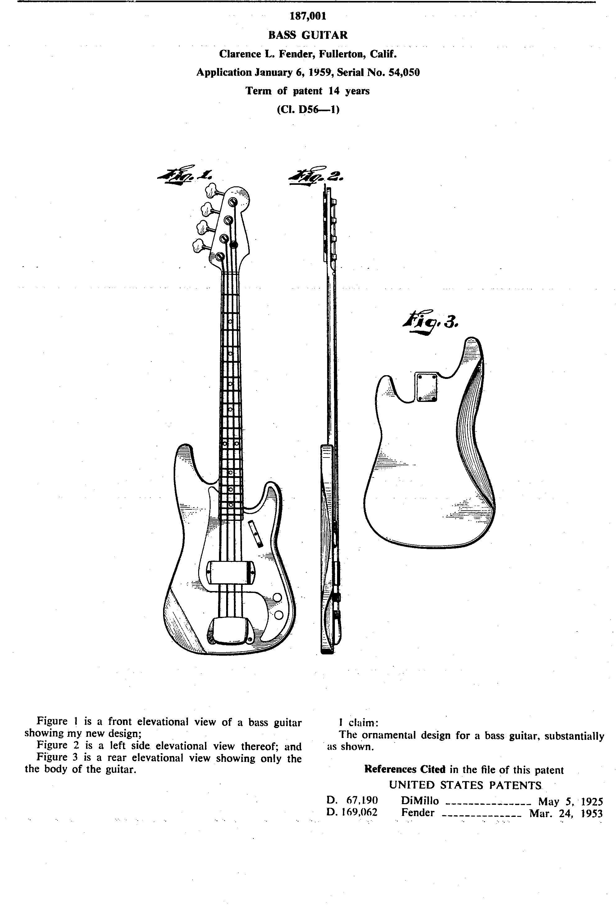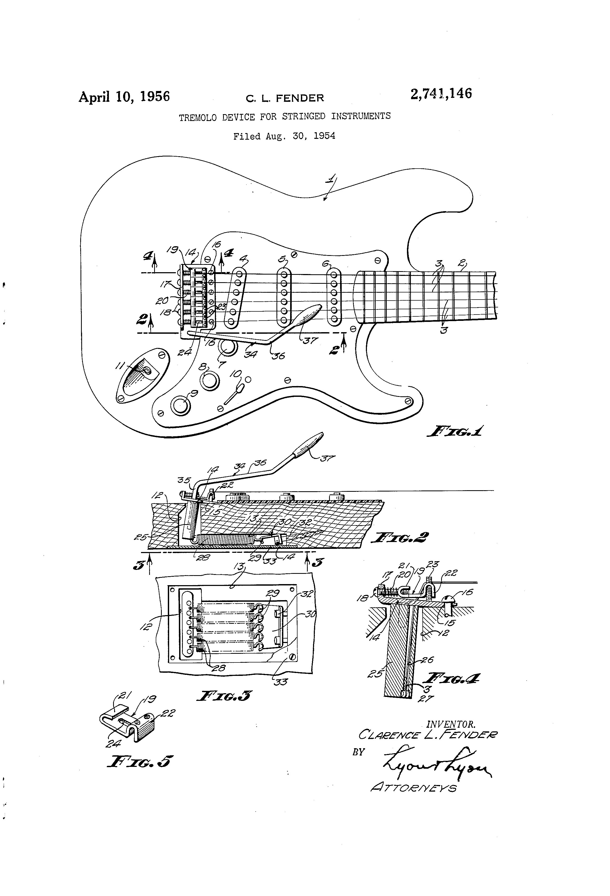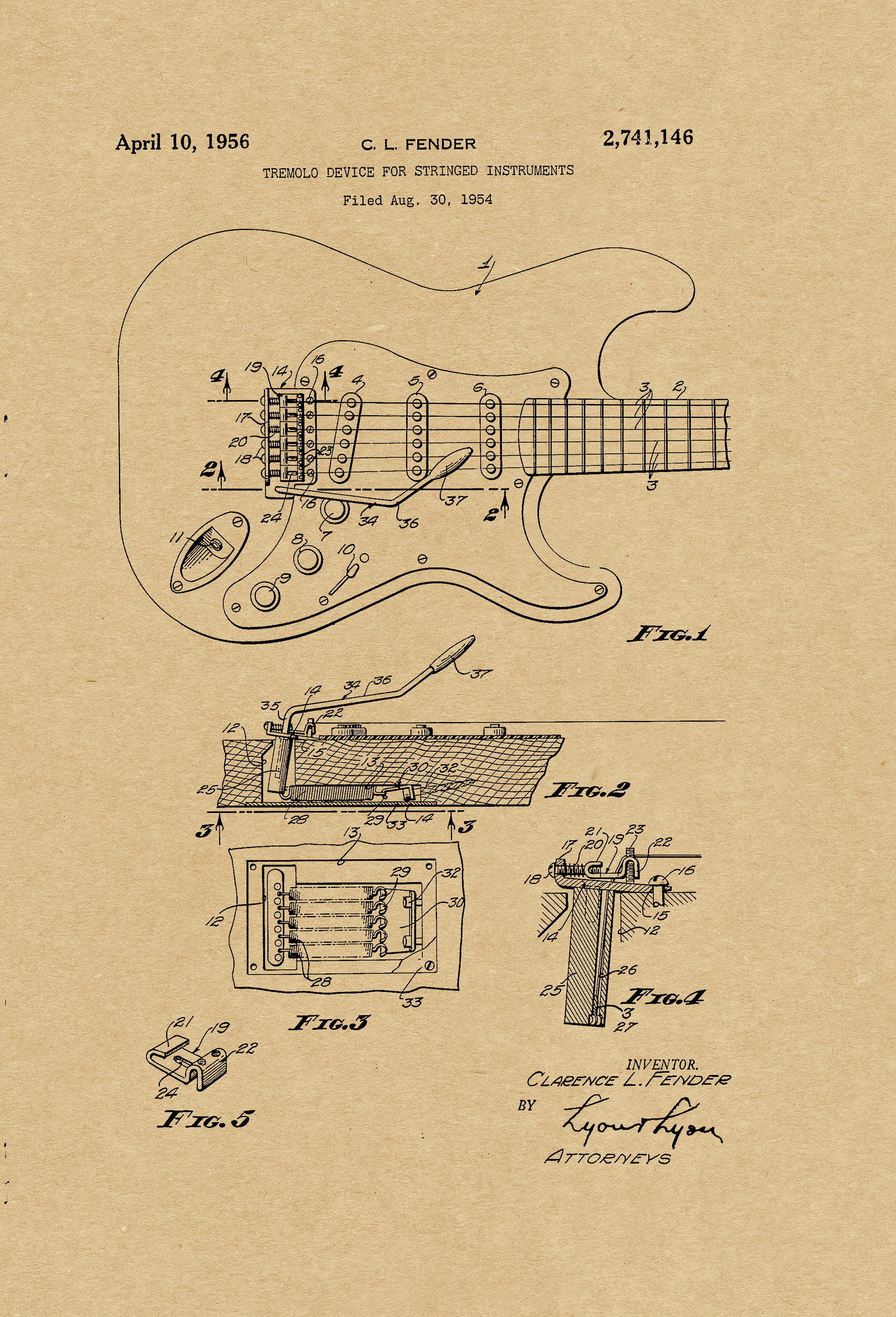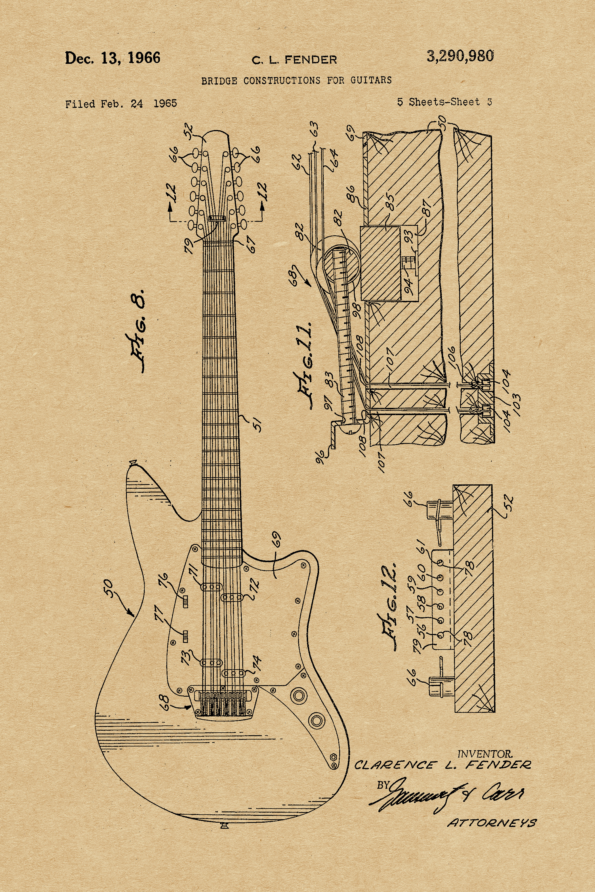 This patent is one of many by Clarence Leonidas “Leo” Fender. He was an American inventor, who founded Fender Electric Instrument Manufacturing Company, or “Fender” for short.
