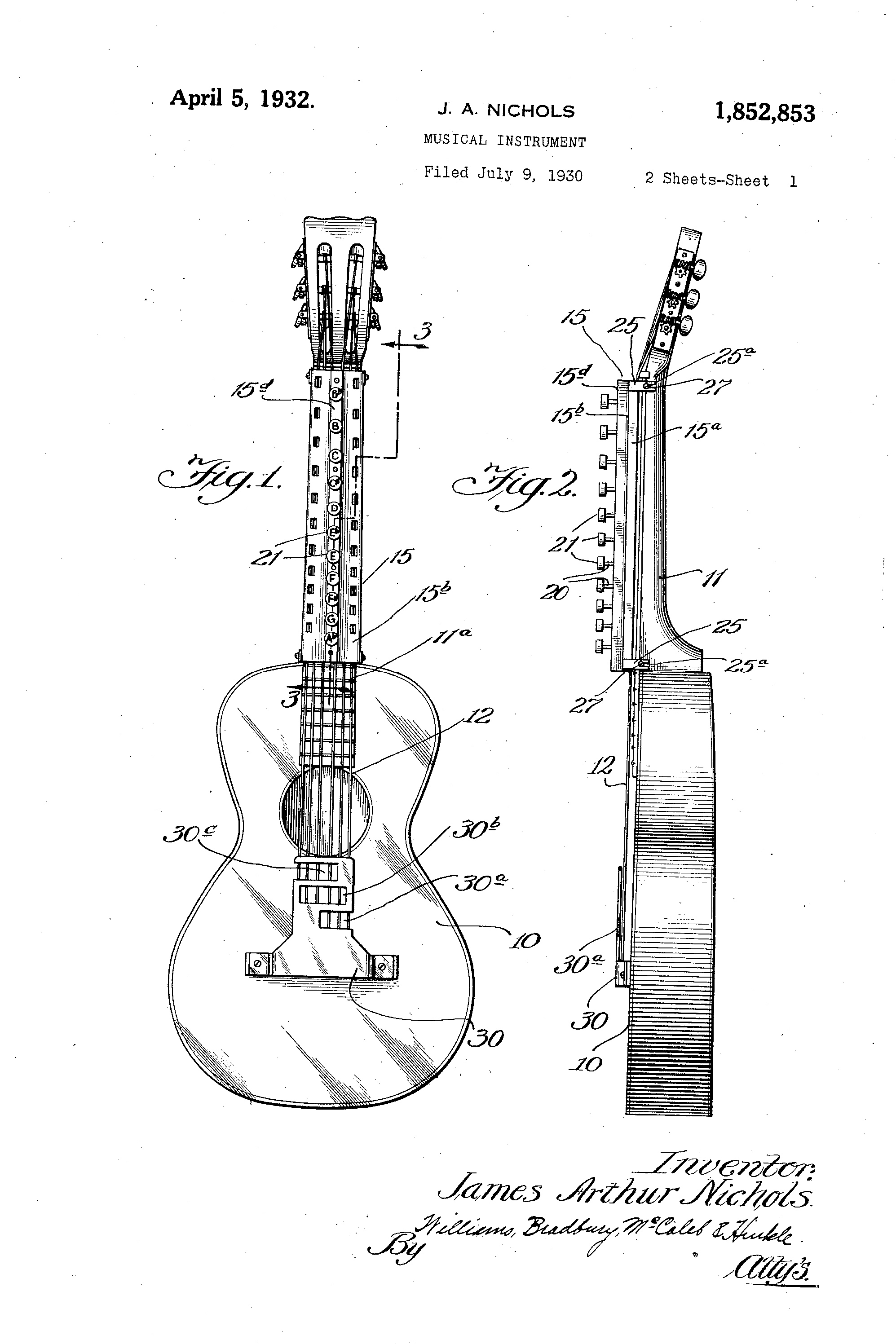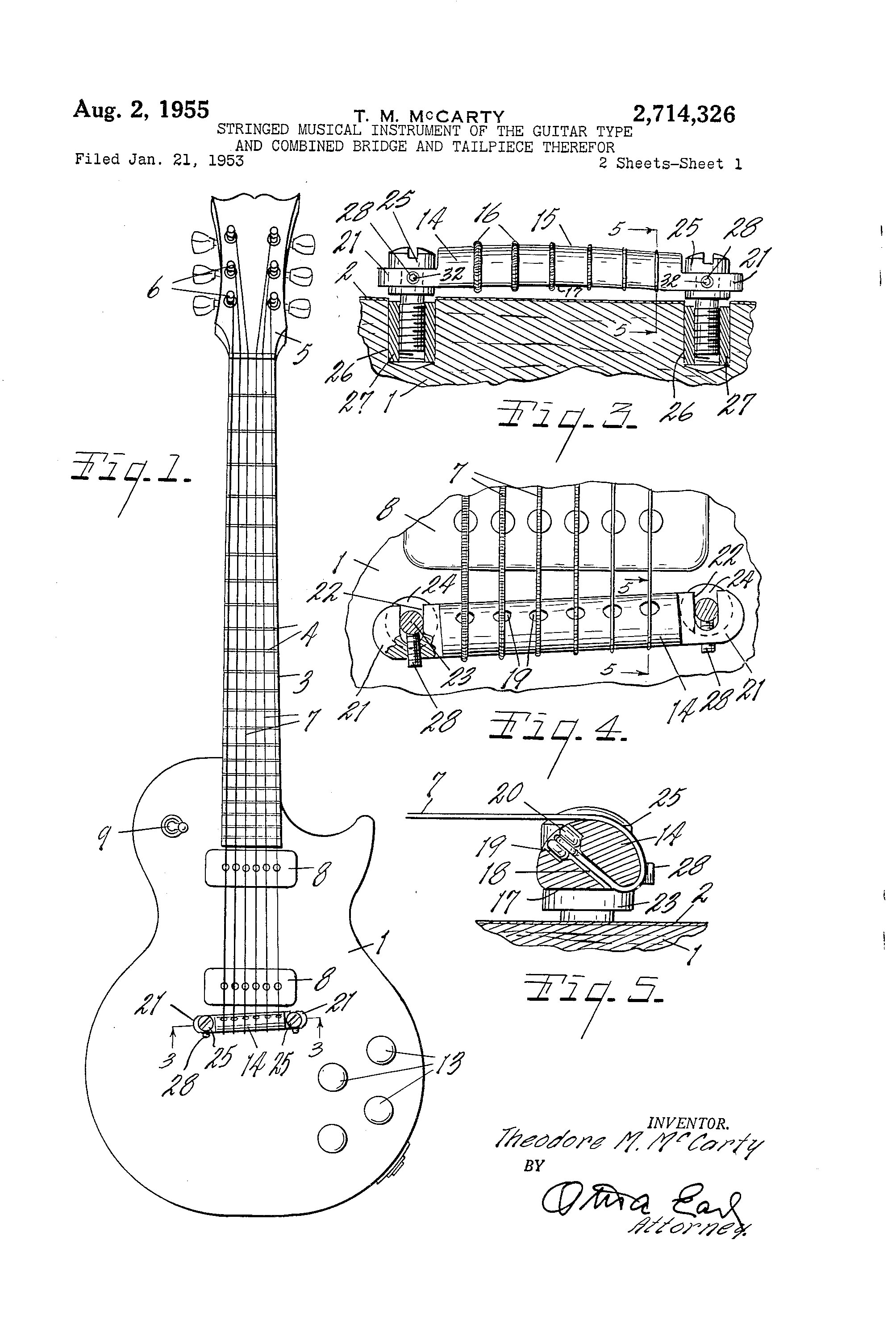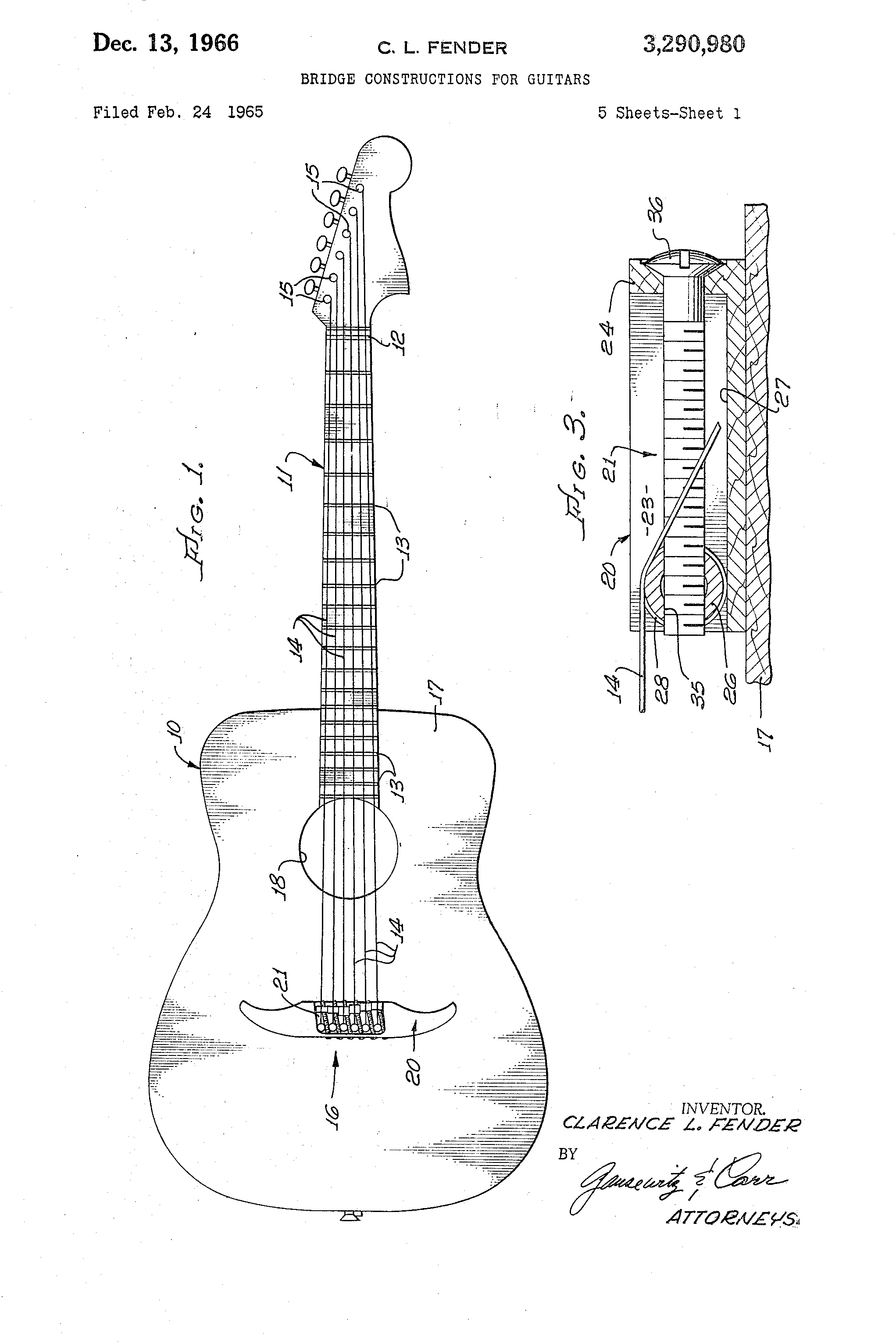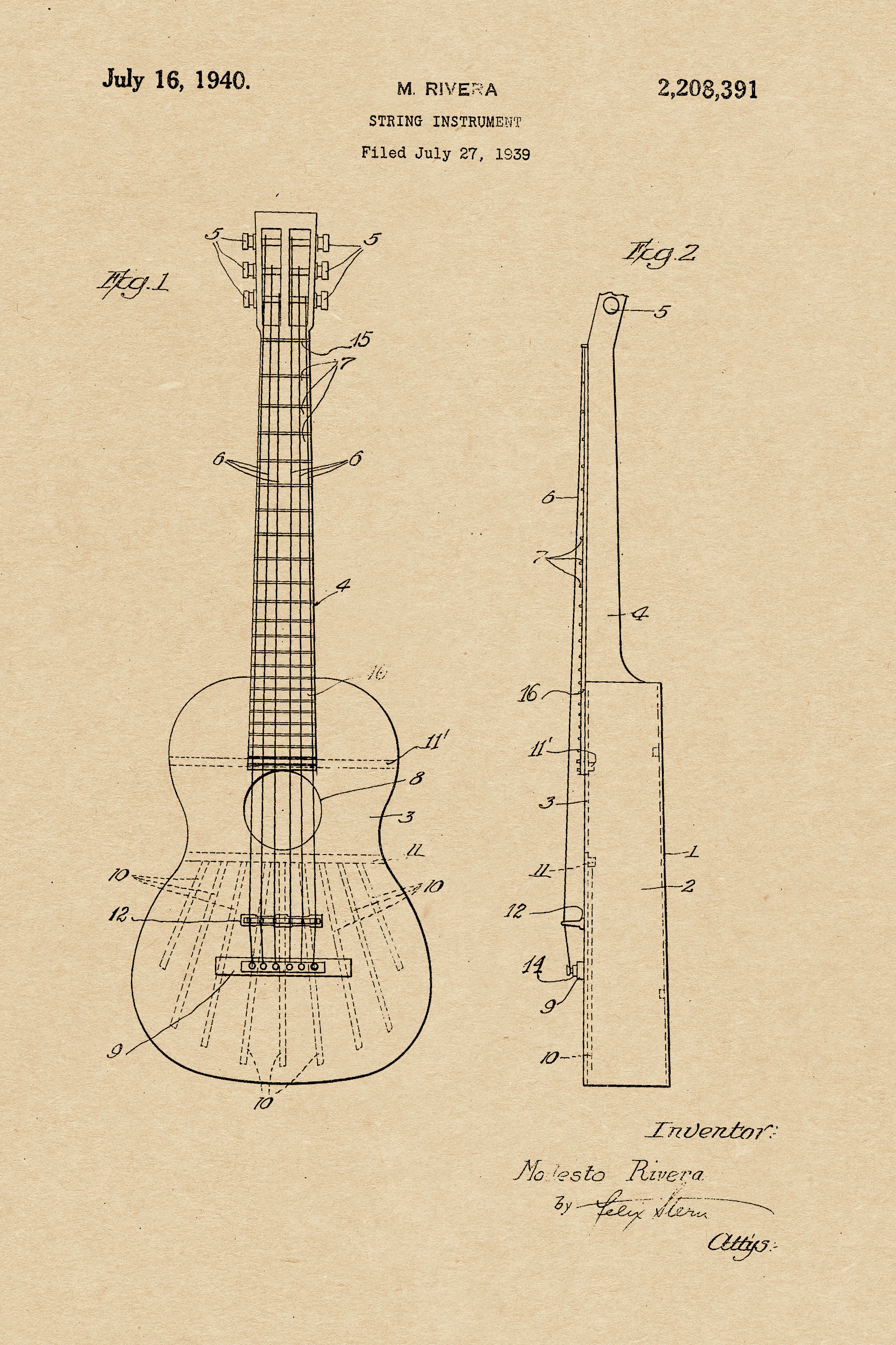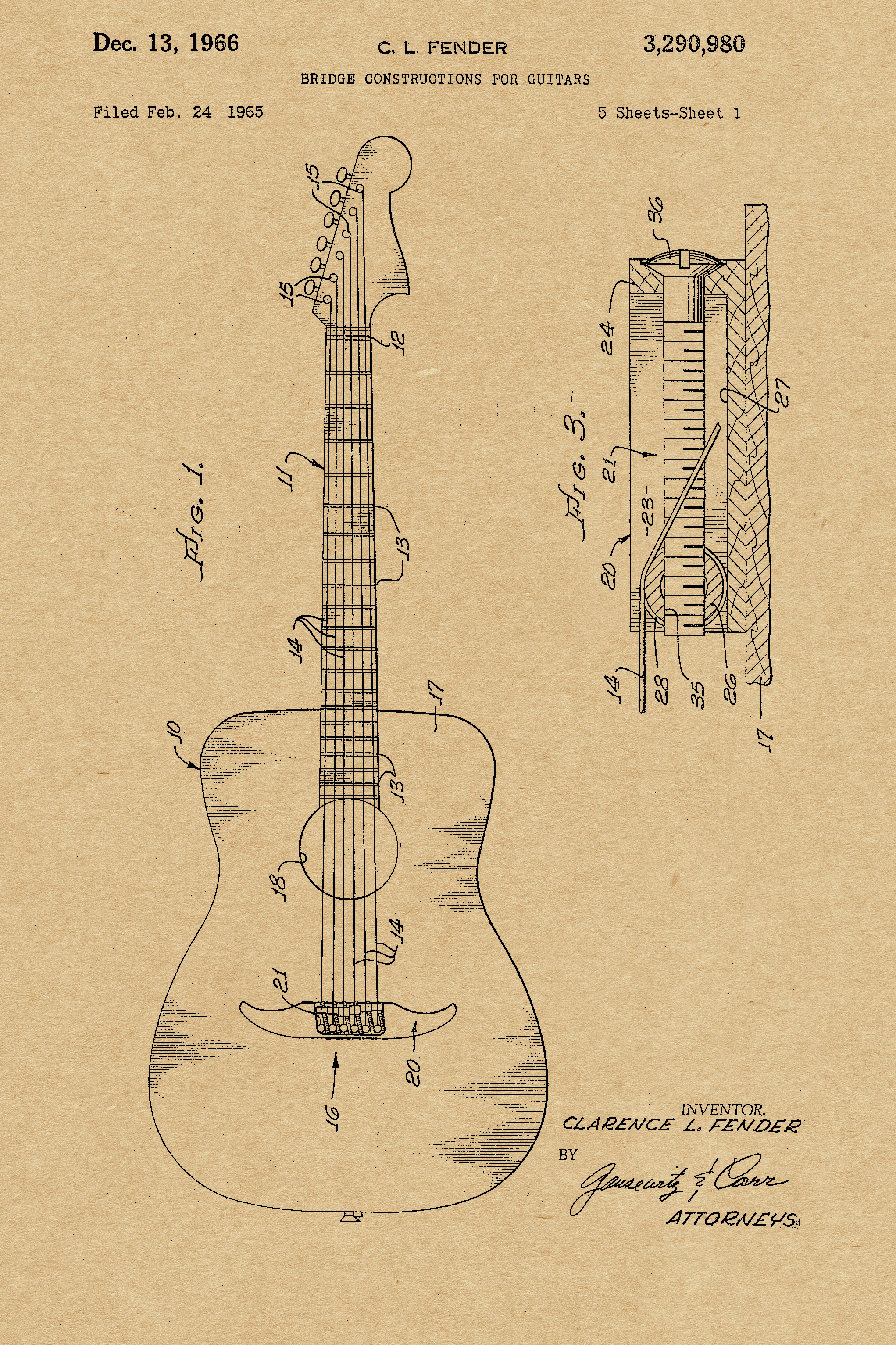 This patent is one of many by Clarence Leonidas “Leo” Fender. He was an American inventor, who founded Fender Electric Instrument Manufacturing Company, or “Fender” for short.