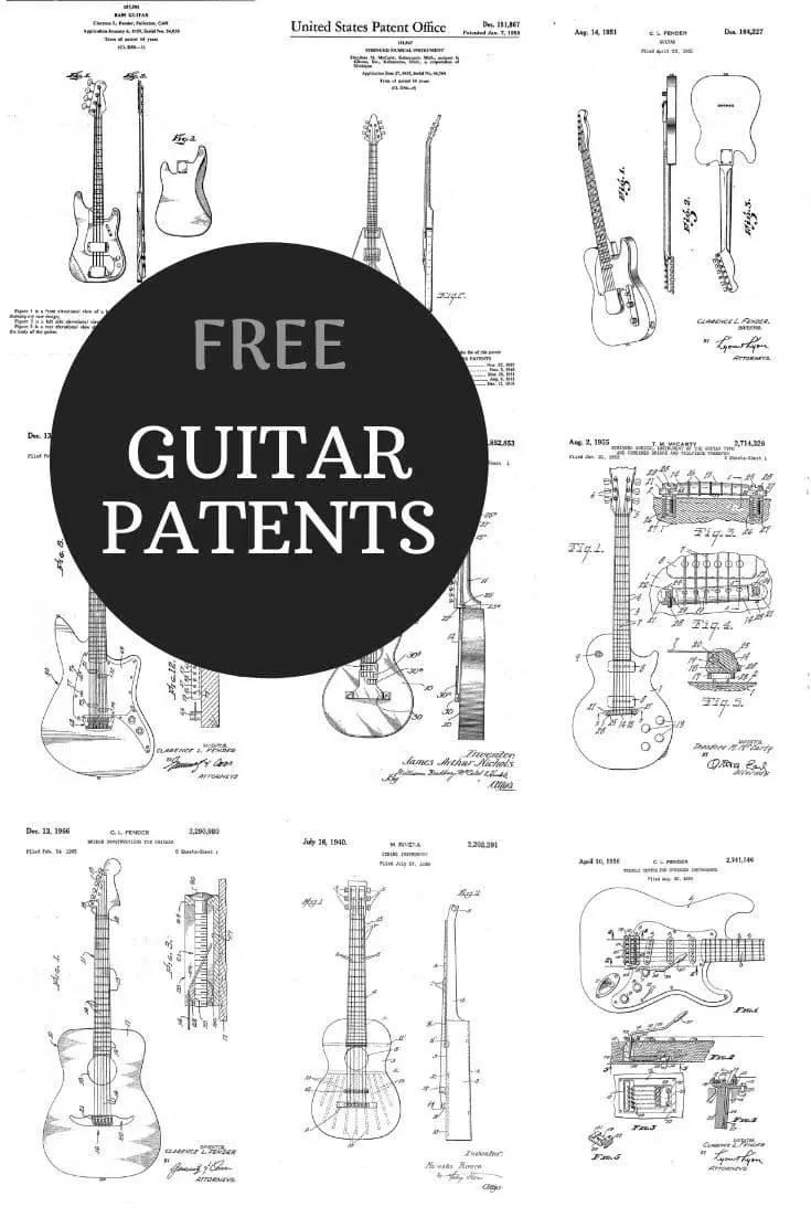 I have curated a collection of free guitar patent prints. The patent printable art can be downloaded with the white background from the Google patent search or with a more vintage Kraft paper background I have designed.
