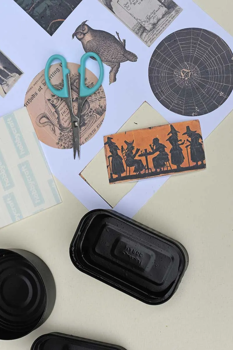 Step 4: Cut out the Halloween-themed images you want and place them in the tins. I used a stack of foam adhesive pads on the back of each picture to raise the images and create a slight 3D effect.