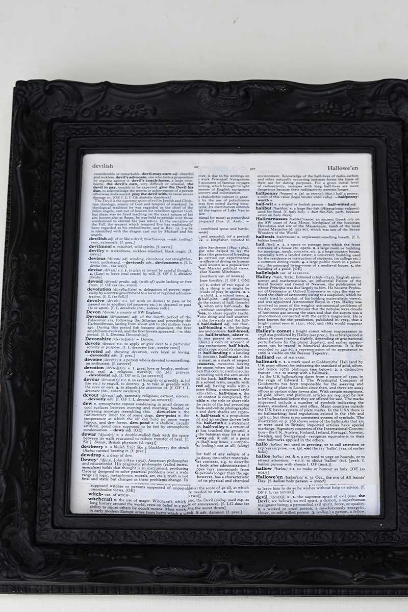 Step 5: Prepare Your Picture Frame: I used an ornate black frame, which ties into the gothic Halloween theme. For the background, I used pages from an old dictionary. Try to find pages with words that fit the Halloween theme (I used ones with “witch,” “devil,” and “Halloween”). This little detail adds an extra layer of spookiness!