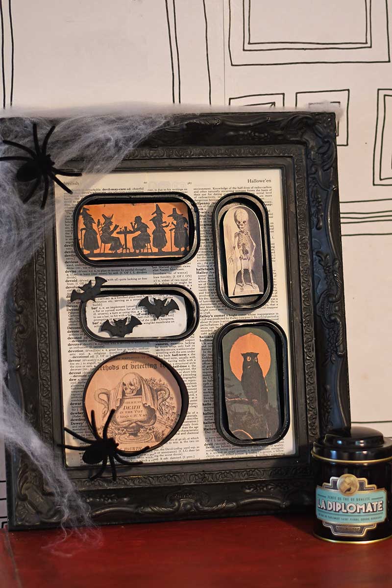 Turn old tin cans and vintage spooky images into a hauntingly beautiful Halloween shadow box. Follow this simple tutorial for eerie yet elegant DIY decor.