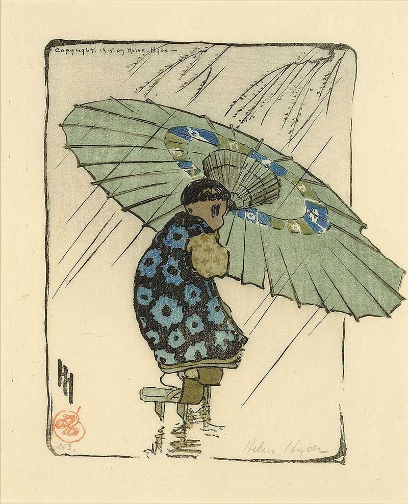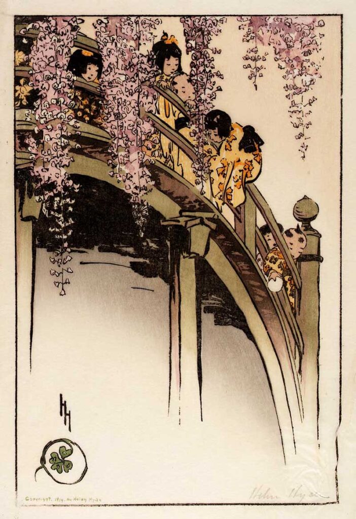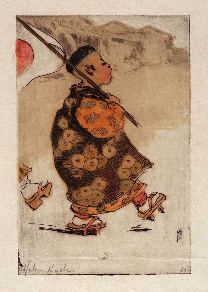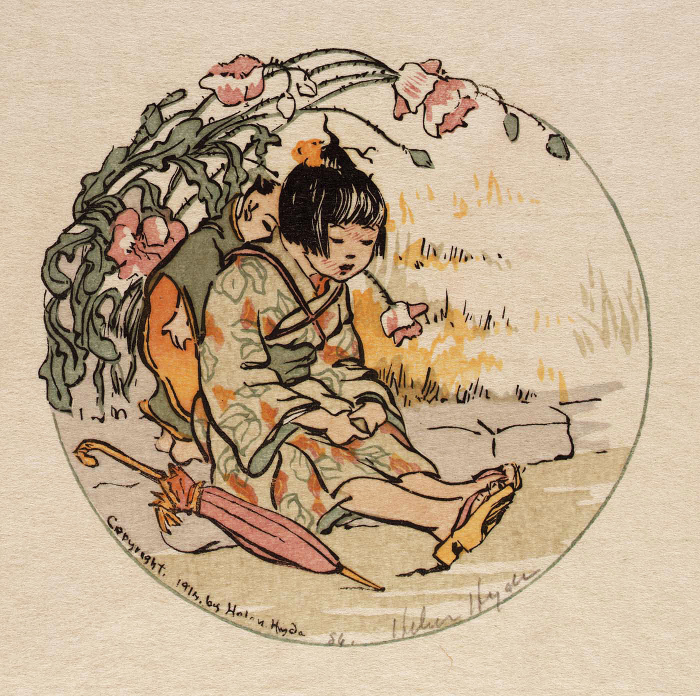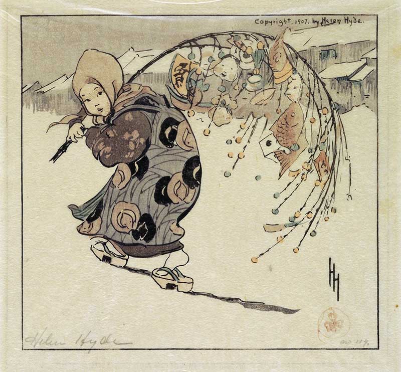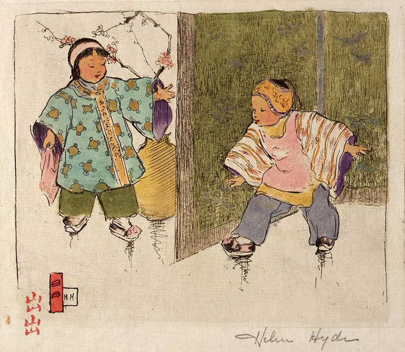 Helen Hyde lived and worked in Japan between 1903-1913 where she learned the Japanese print woodblock techniques. The majority of her artistic work reflected Japanese landscapes and local women and children in domestic settings.