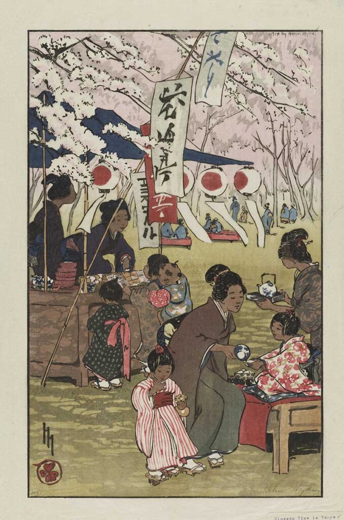 Helen Hyde print shows mothers and children drinking tea and eating among cherry blossoms.