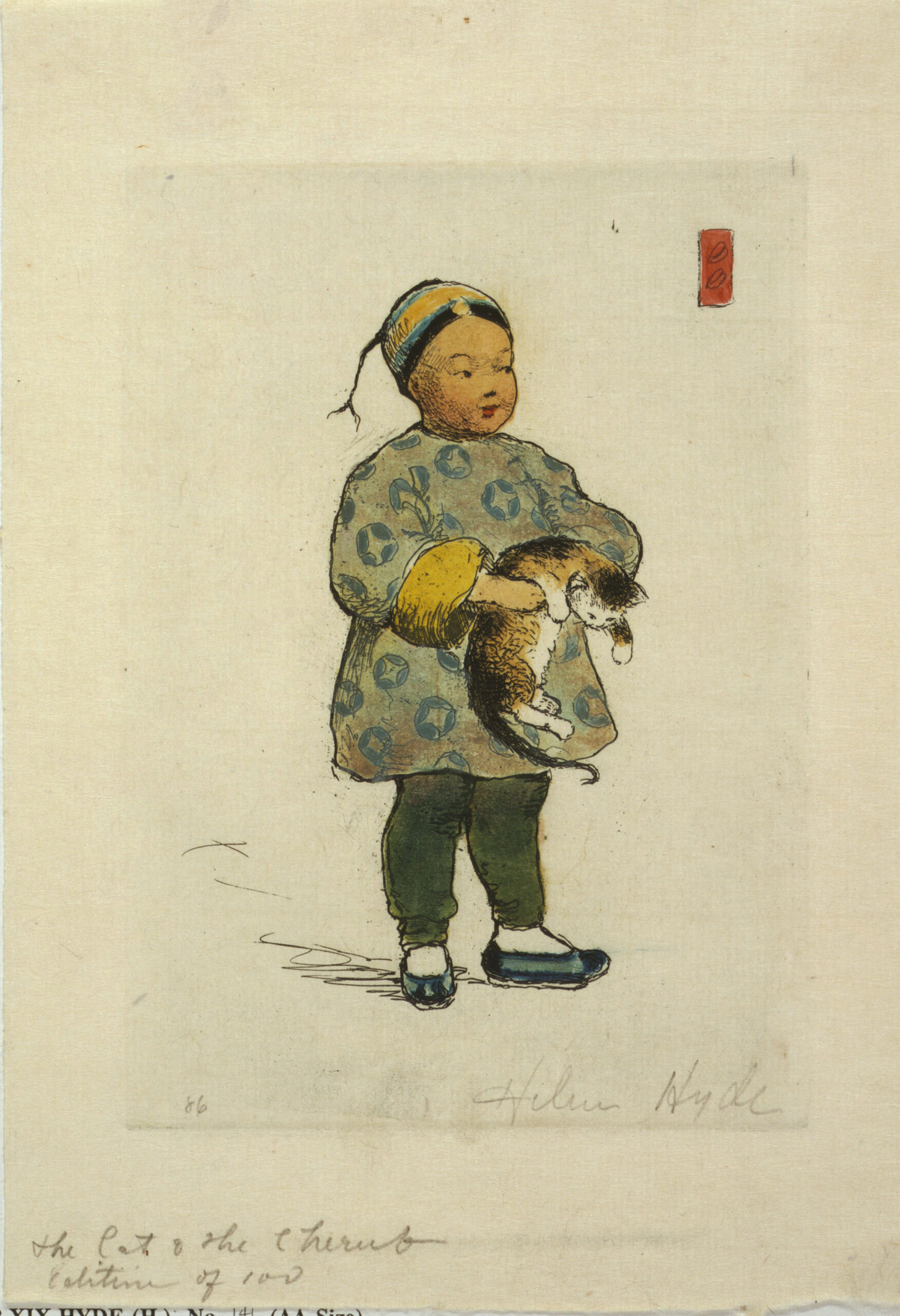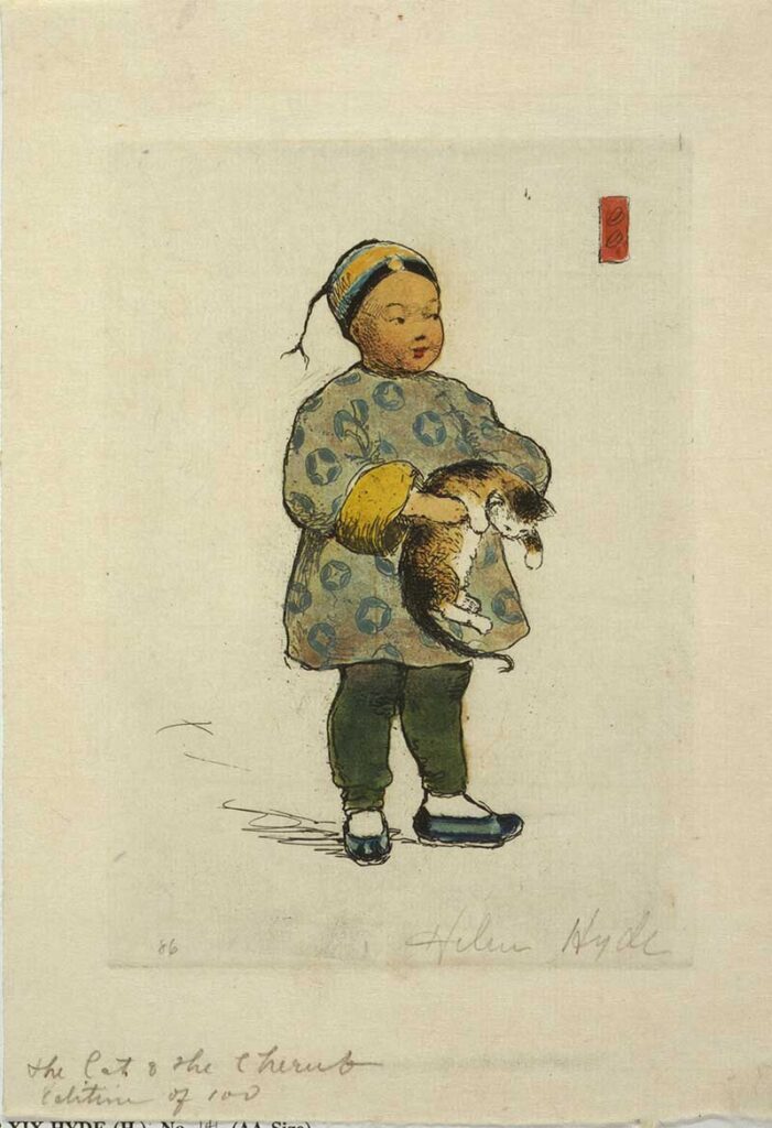 A Chinese boy holding a cat. This print of Helen Hyde was from the time she spent sketching women and children in San Francisco’s Chinatown.