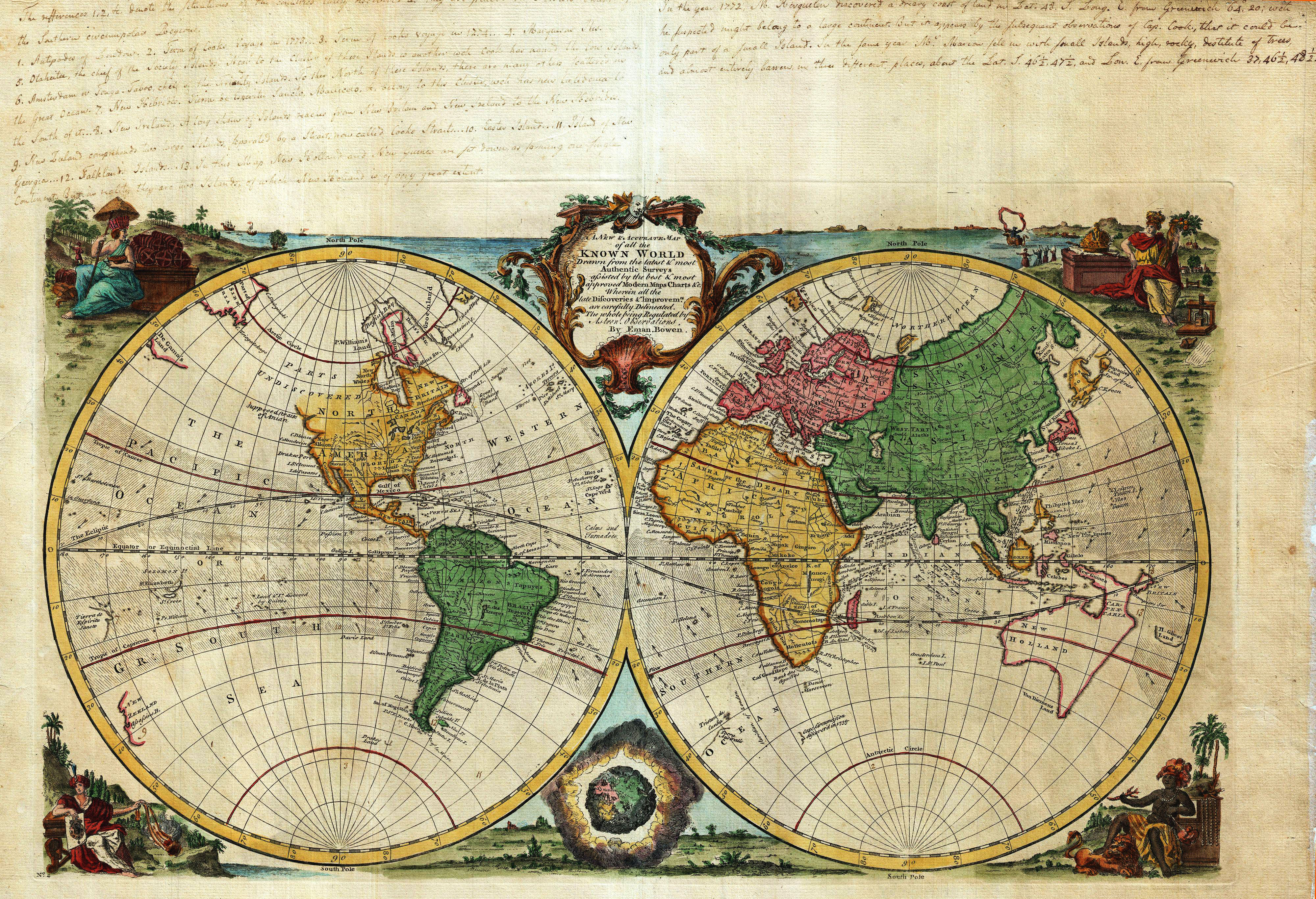A beautiful 1744 decorative double hemisphere world map by the English cartographer Emmanuel Bowen.