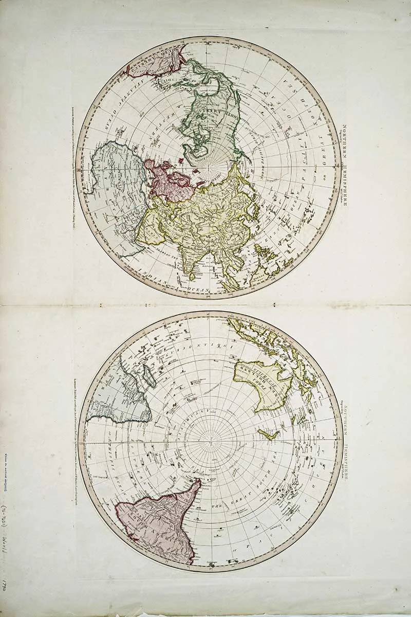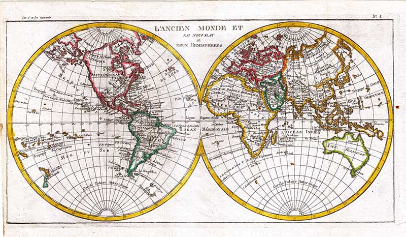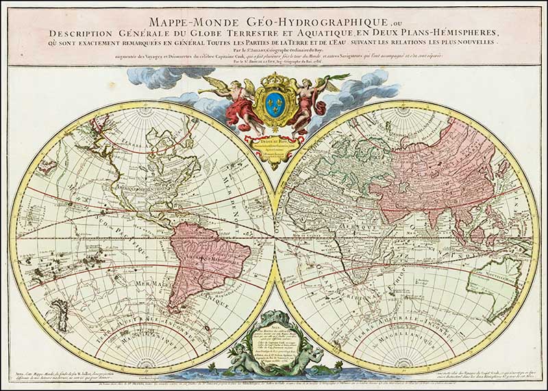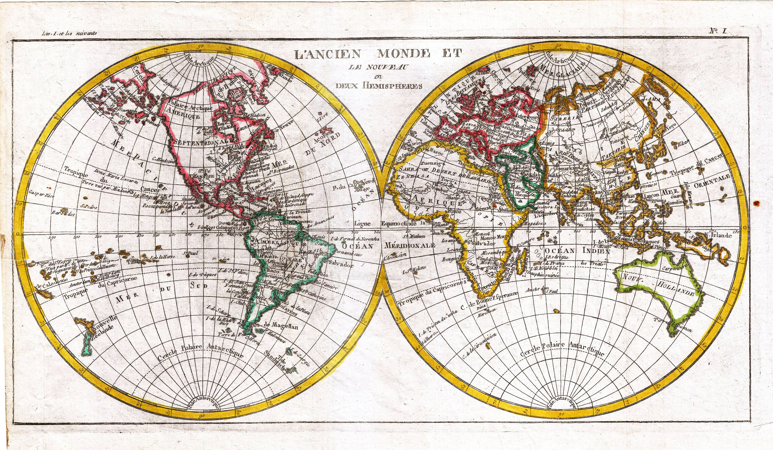 Rigobert Bonne and G. Raynal’s 1780 map of the world on a hemispherical projection. The map offers a number of interesting details corresponding to the knowledge of the world at the time.