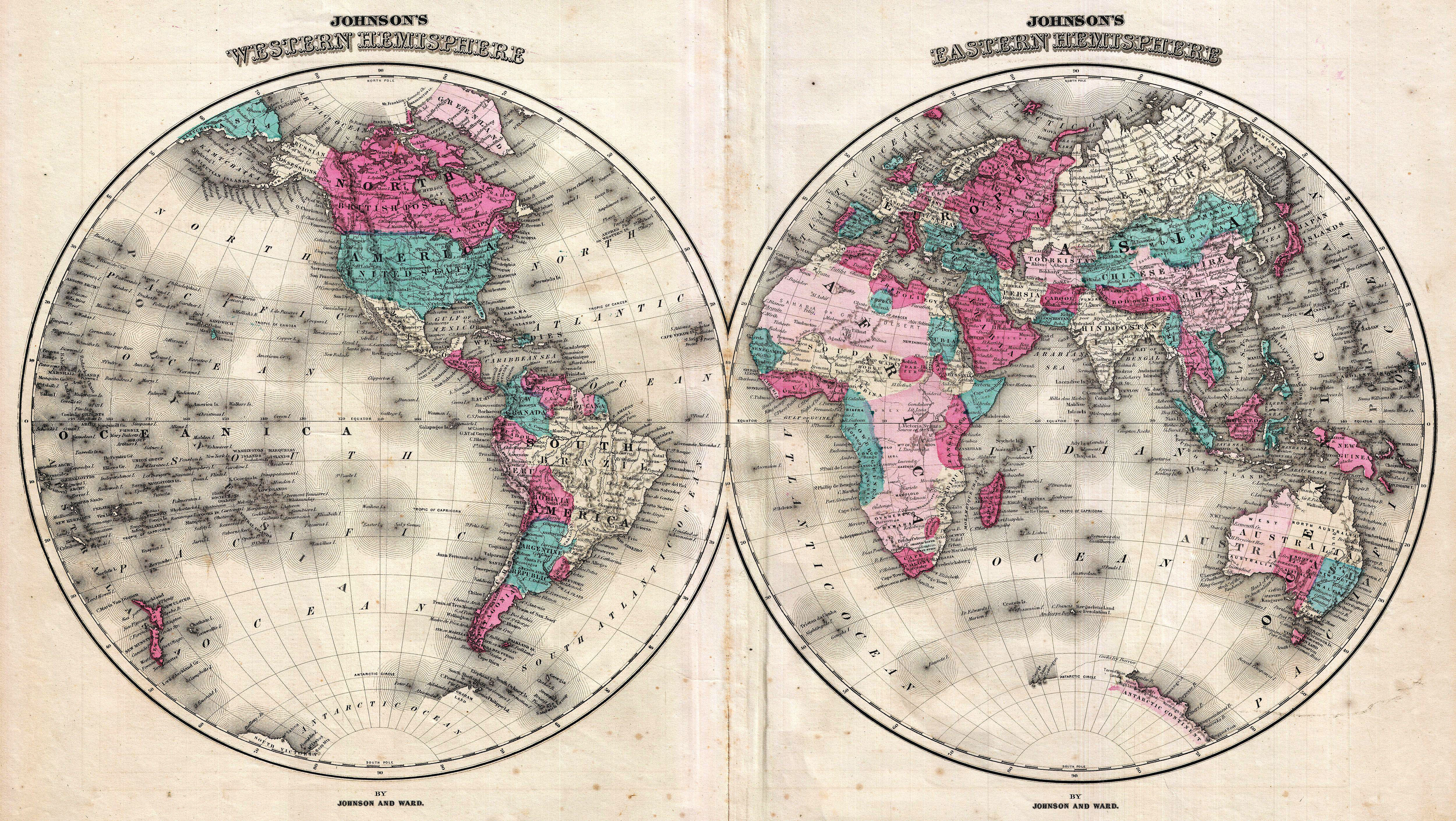 This is A. J. Johnson’s 1866 map of the world on a hemispherical projection. The map shows a snapshot of the world during a period of rapid globalization and discovery.