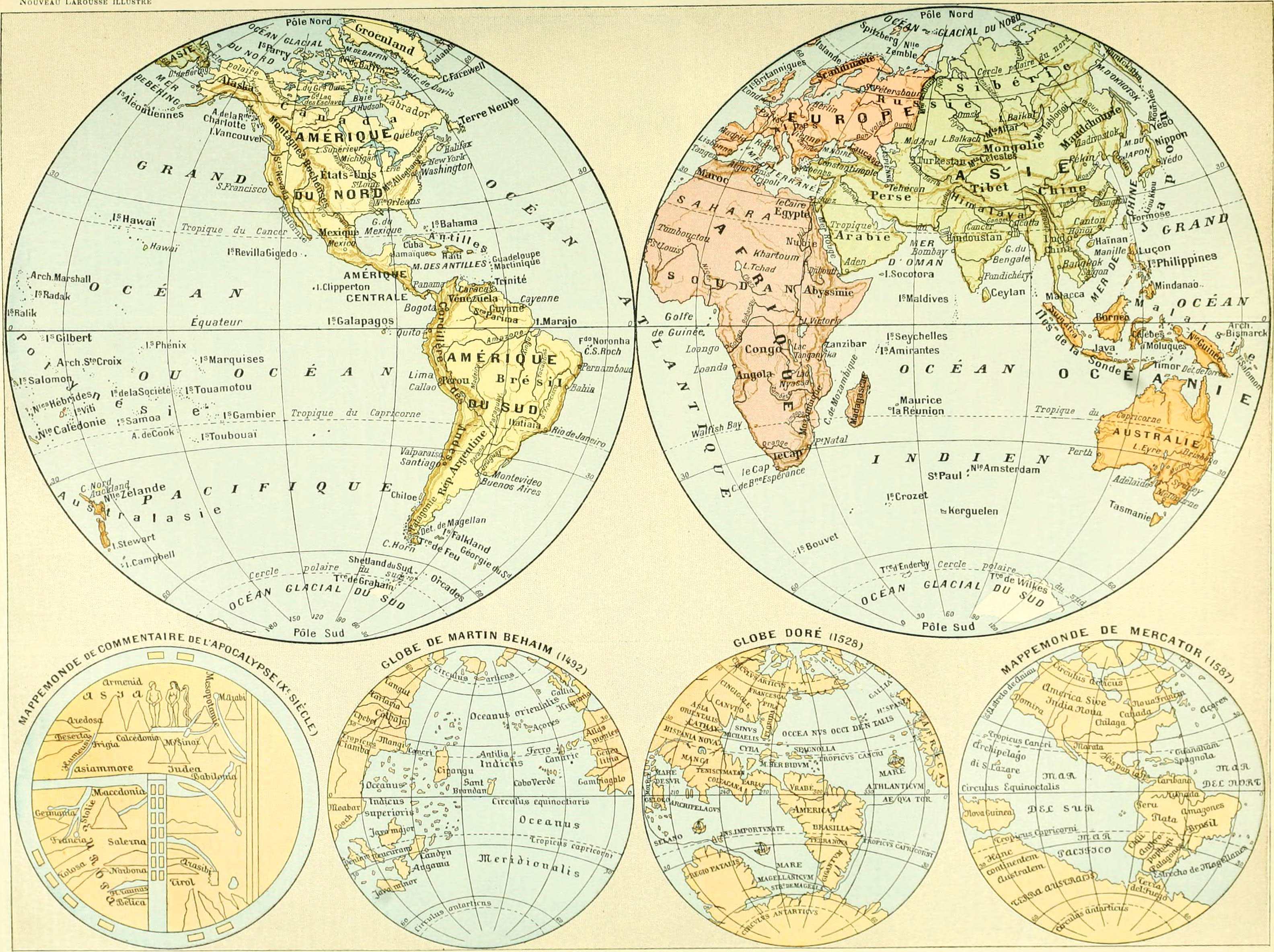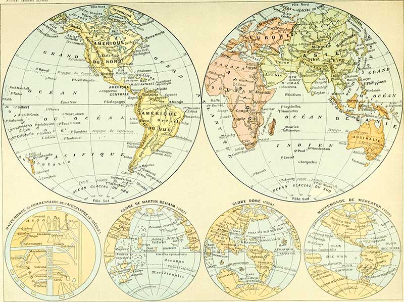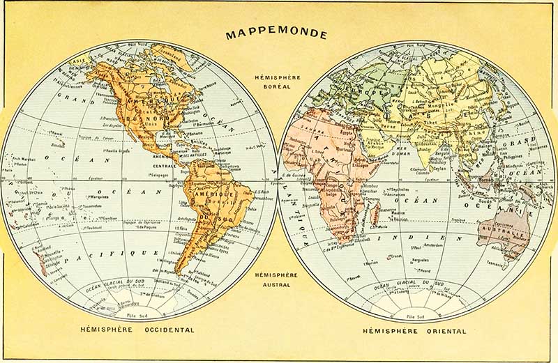 This hemispherical map of the world is from the well known French encyclopedia Nouveau Larousse illustré – dictionnaire universel encyclopédique (1898).