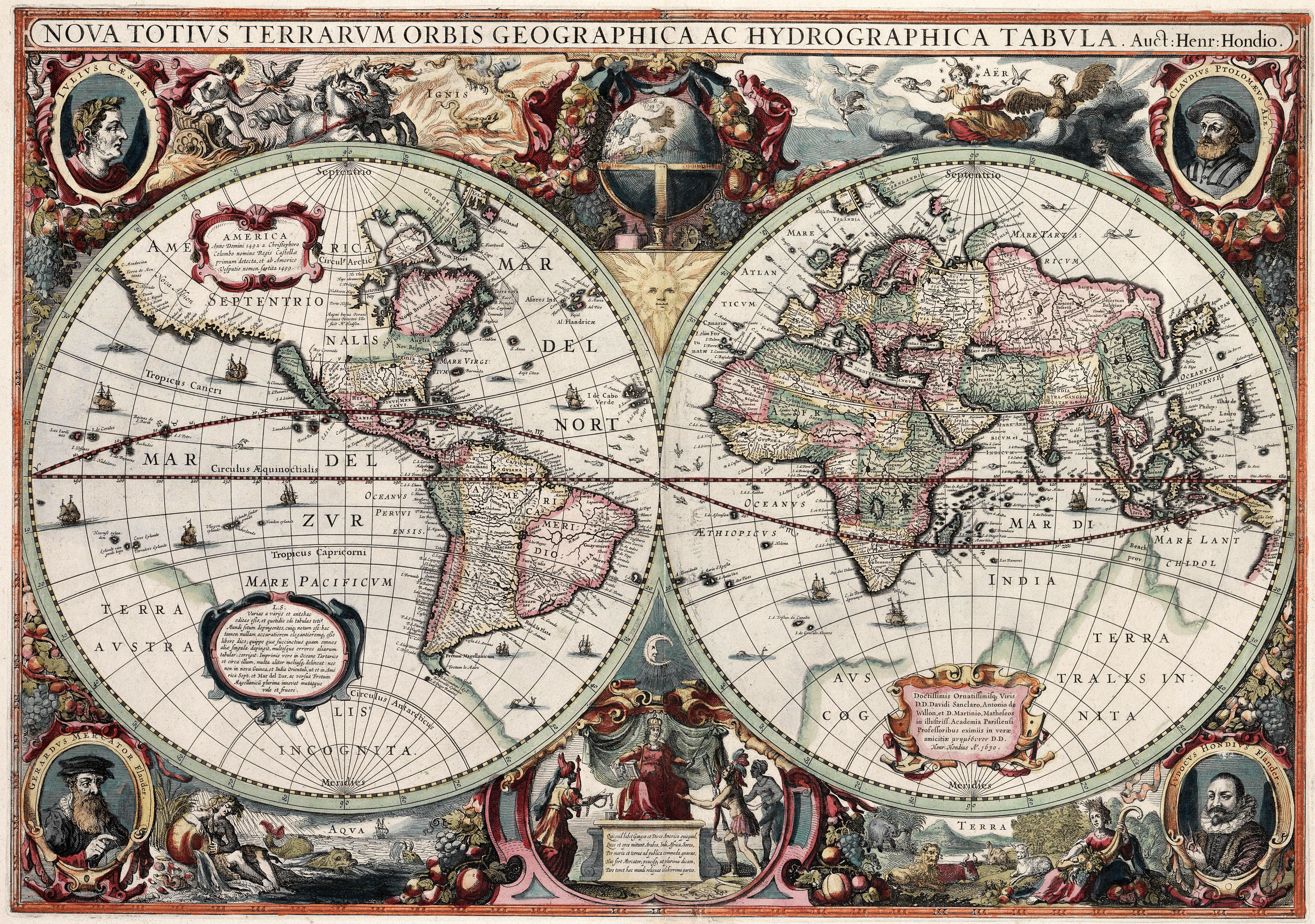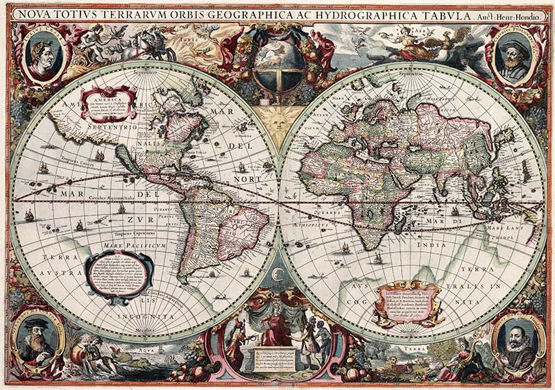 This is an image of “Nova totius Terrarum Orbis geographica ac hydrographica tabula“, a map of the world created by Hendrik Hondius in 1630.