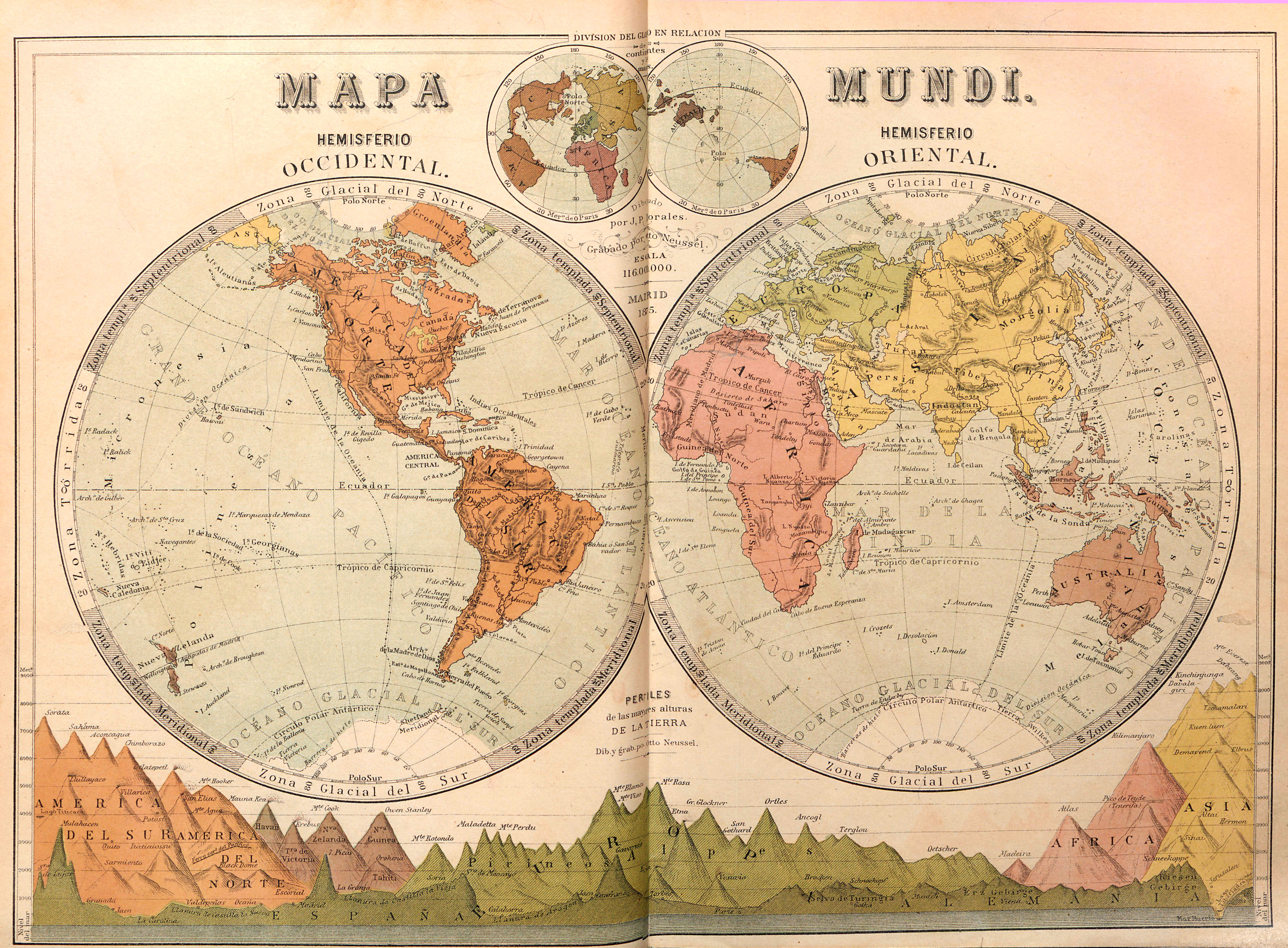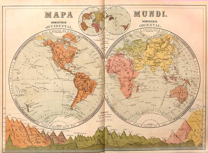 As well as showing the Western (Occidental) Hemisphere and the Eastern (Oriental) Hemisphere, there is a small insert double hemisphere map of the Northern and Southern Hemispheres.