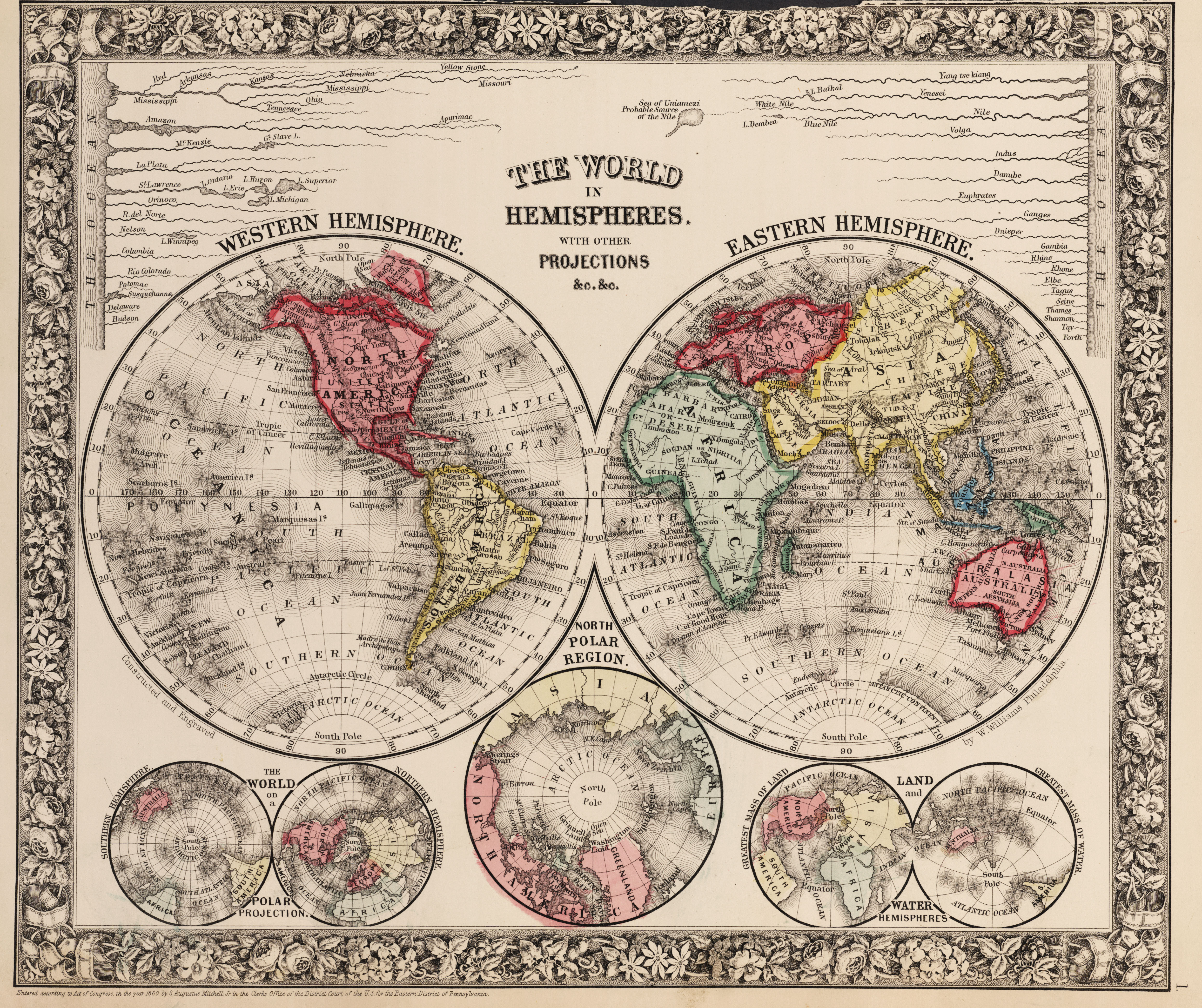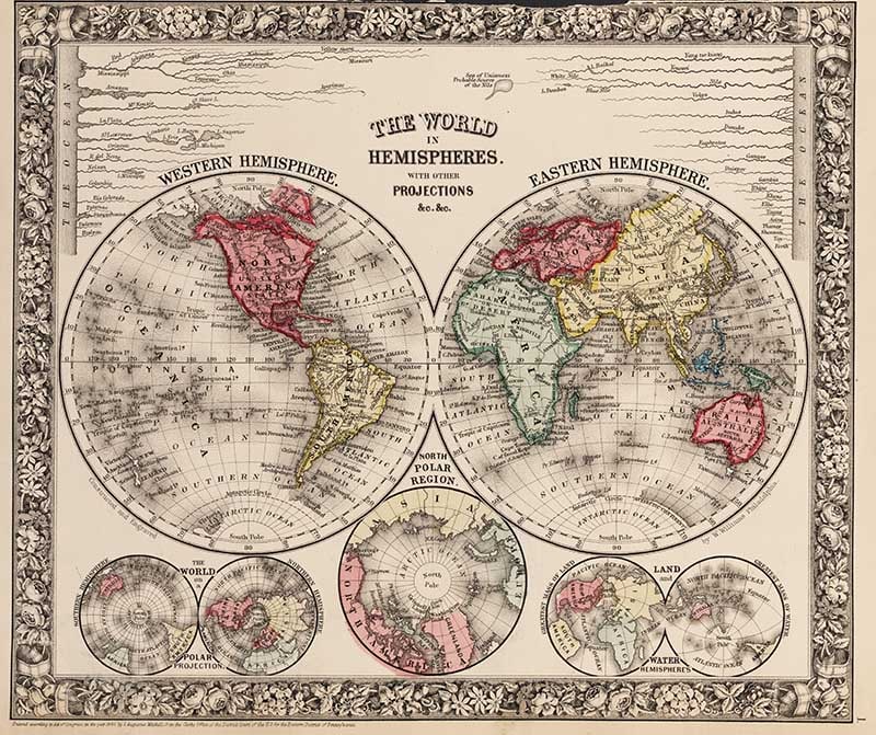 An 1860 map by Samuel Augustus Mitchell. All four hemisphere maps are on this print with a few other world map projections too.