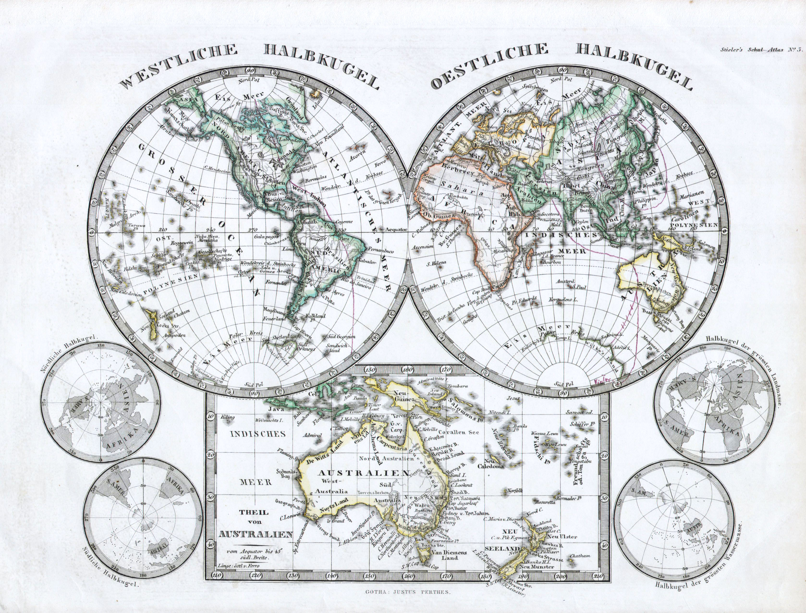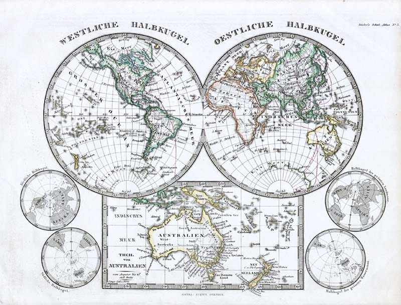 1862 map by Justus Perthes and Stieler depicts the world in two hemispheres with a special area dedicated to Australia and New Zealand. For smaller maps depict the north and south polar regions.