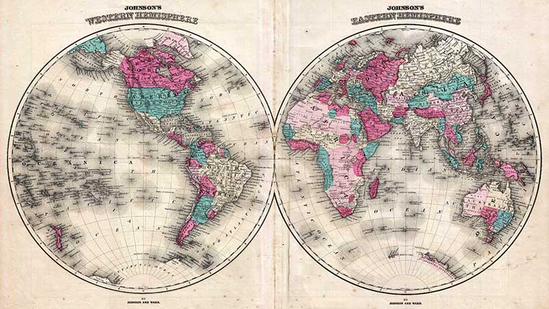 17. 1866 Johnson Map of the World in Hemisphere Maps