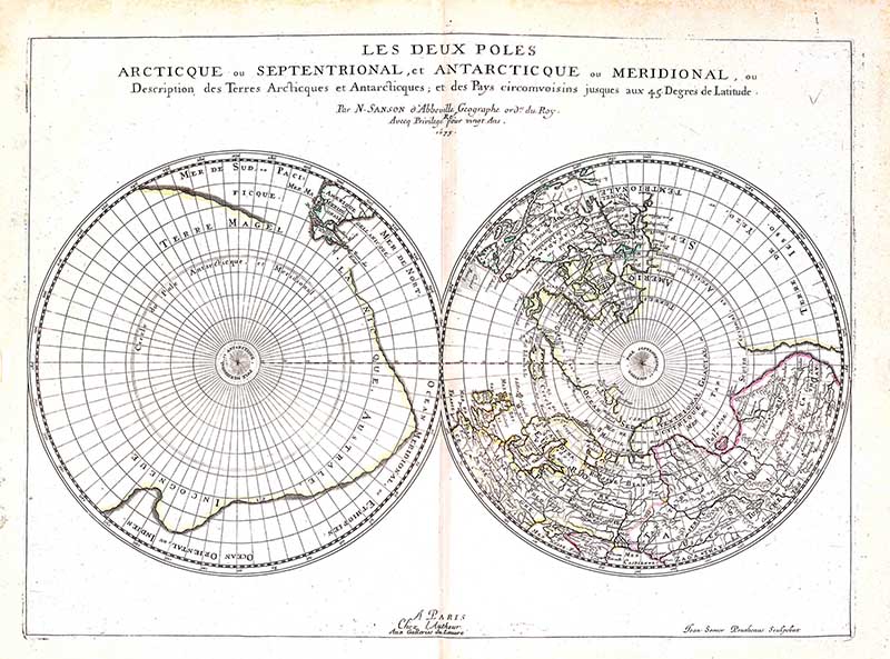 Sanson’s Northern and Southern hemisphere maps focus on the geographic information, the space around the double hemispheres is intentionally left blank.