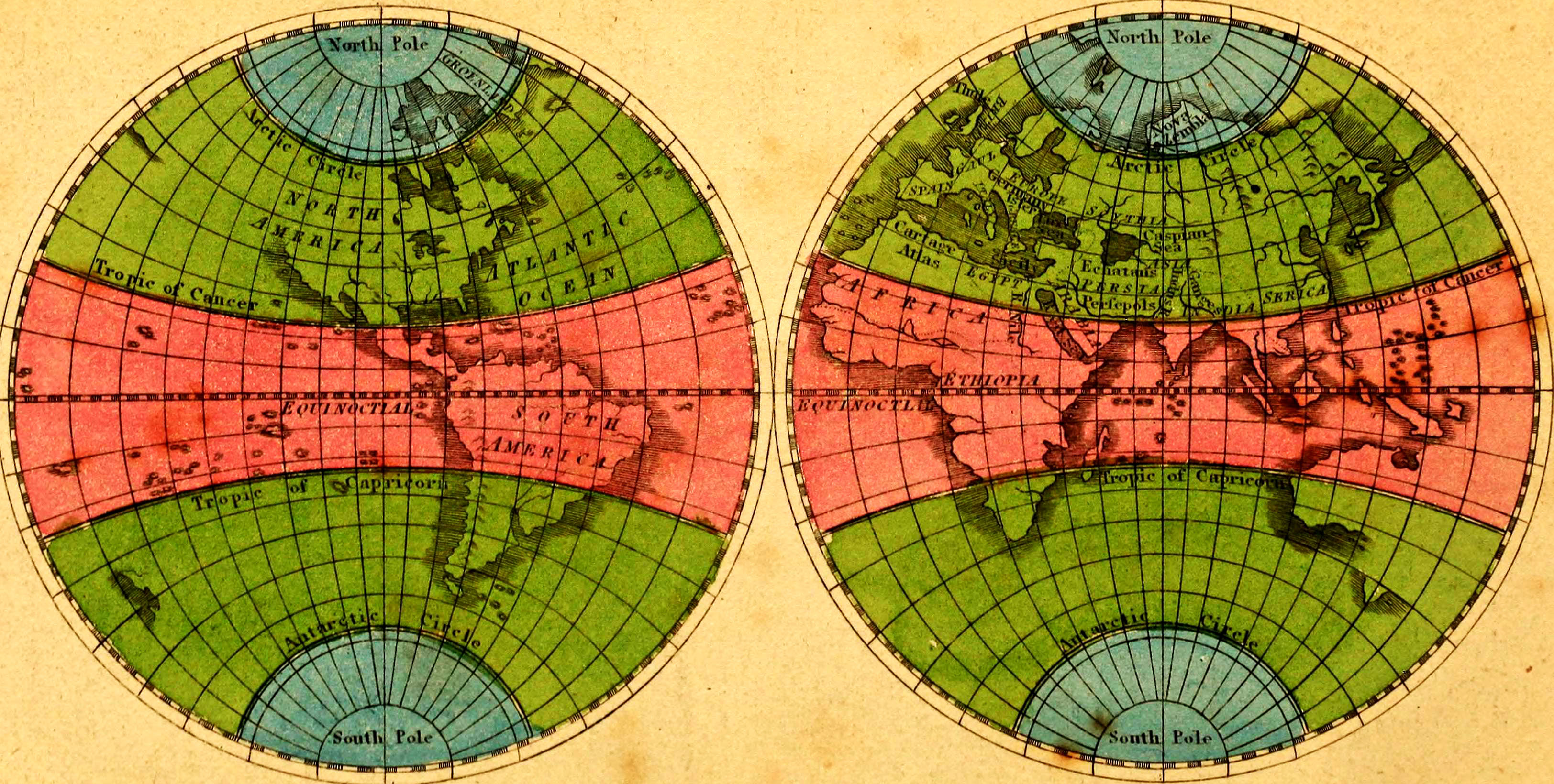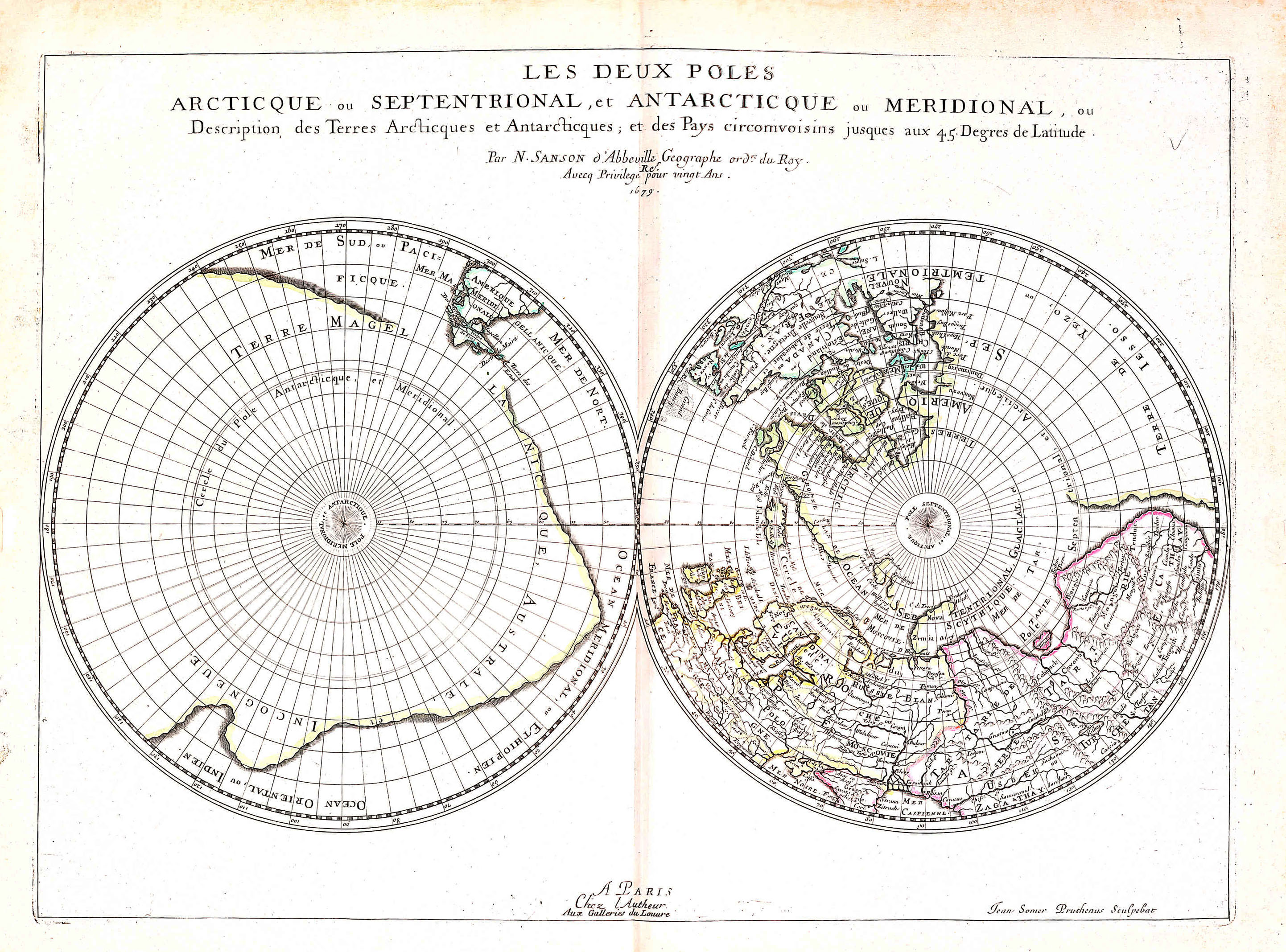 An old hemispherical map from the perspective of the Arctic and Antarctic from 1651.