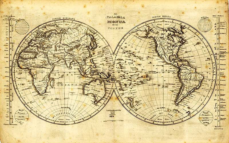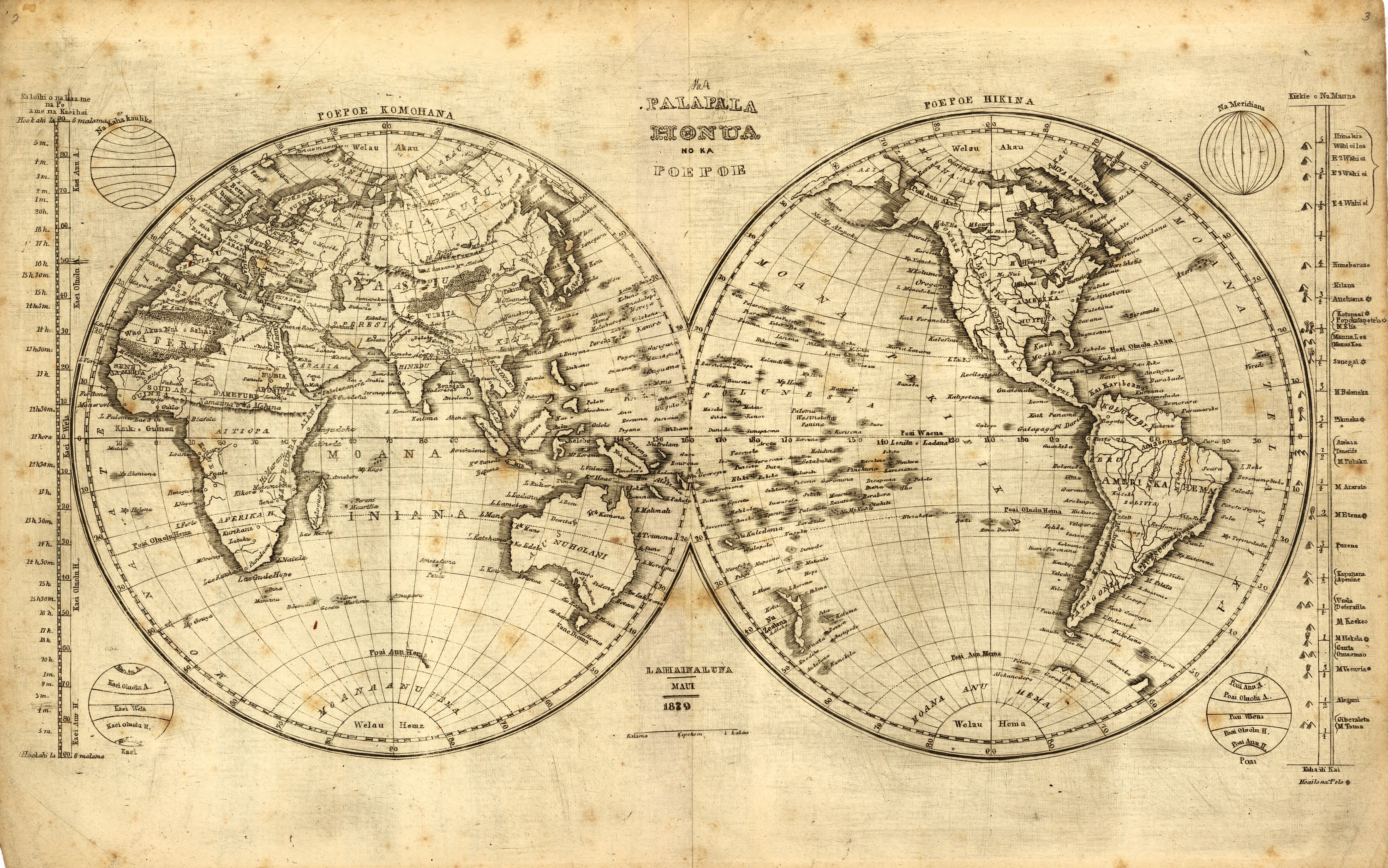 The Hawaiian language version of a world map was engraved to aid students in learning geography of the world.