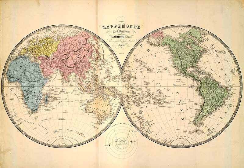 A double hemisphere vintage world map by the French cartographer Vuillemin. This map is unusual in that it shows the Eastern hemisphere on the left and the Western on the right.