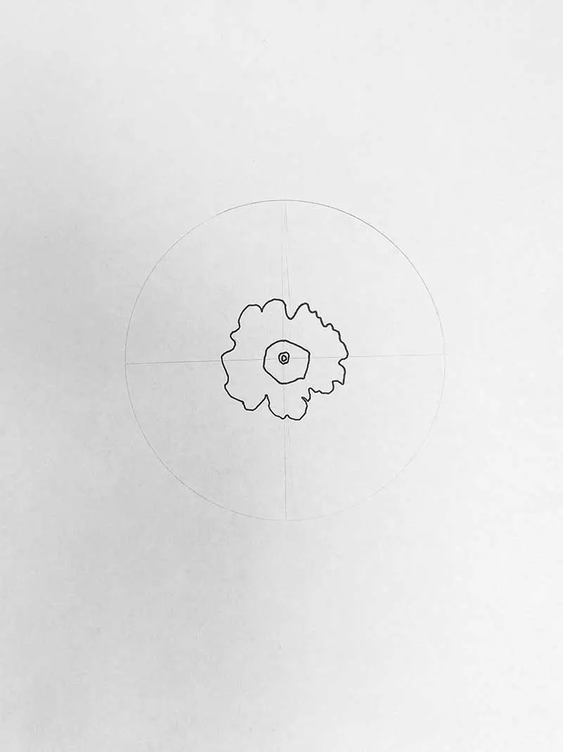 Step 1: As in the previous tutorial, start by drawing a circle in pencil that is the size of the flower head you are drawing. This will help guide you. In the centre, draw two circles: one for the centre, which will contain the stigma and one for the wavy edges of the corona or trumpet.