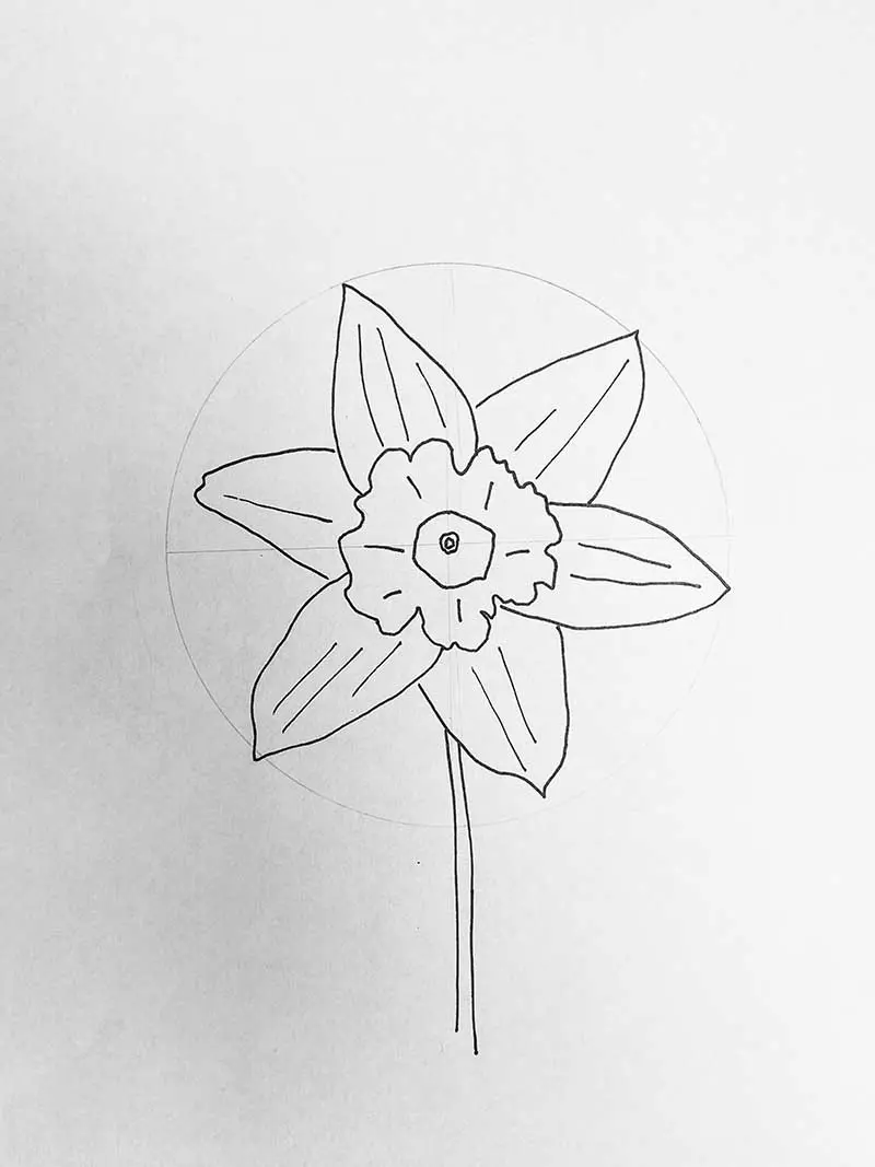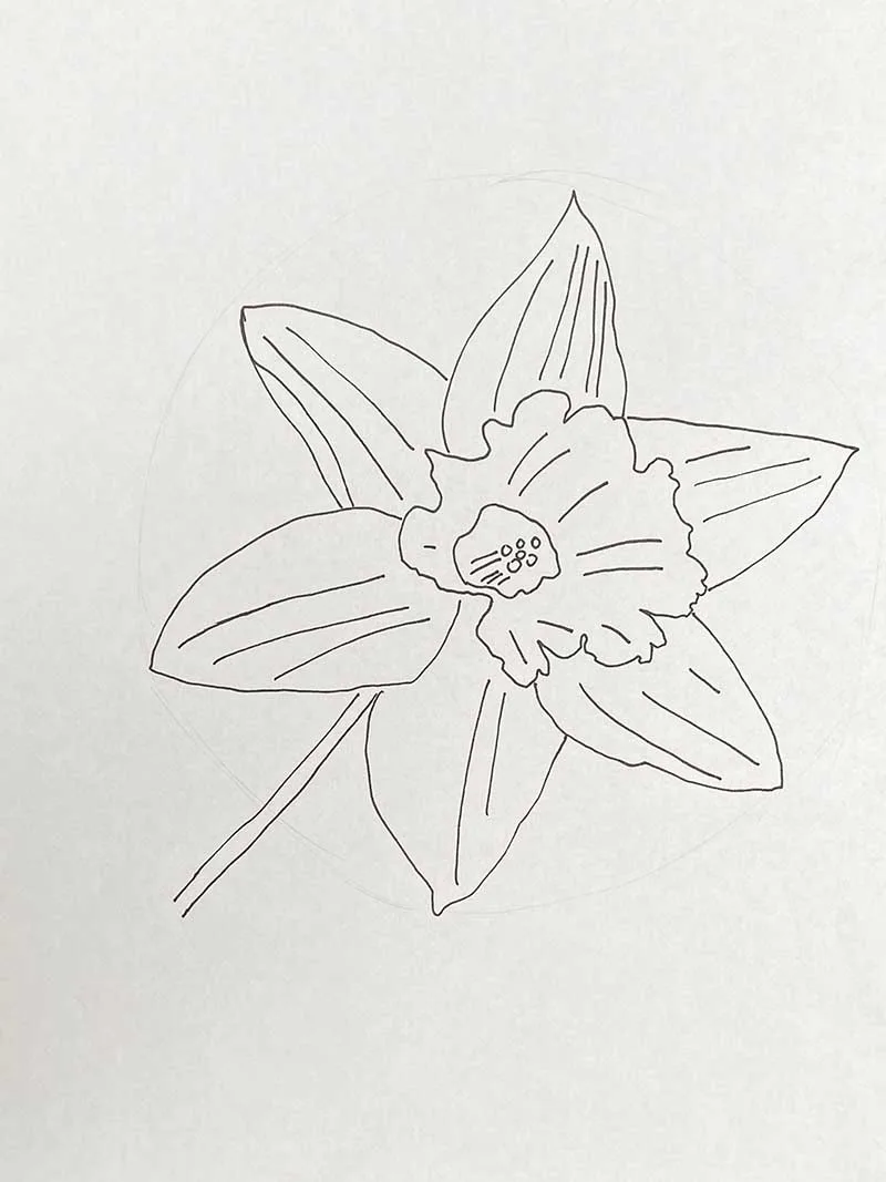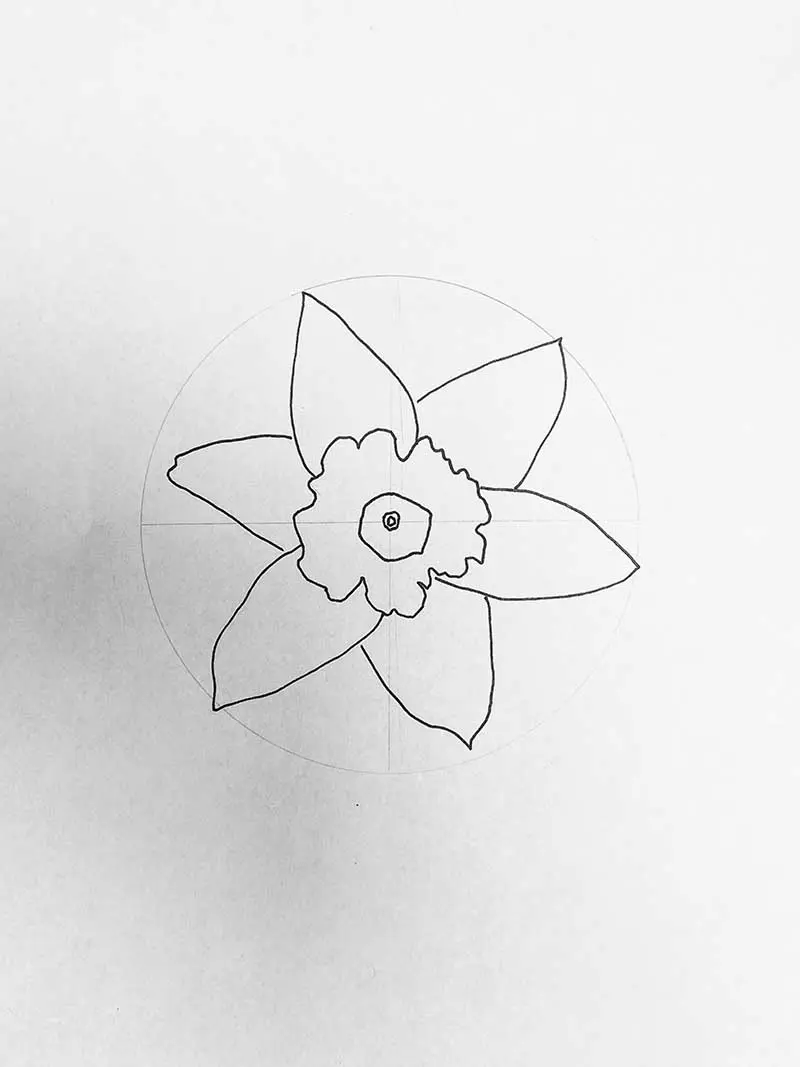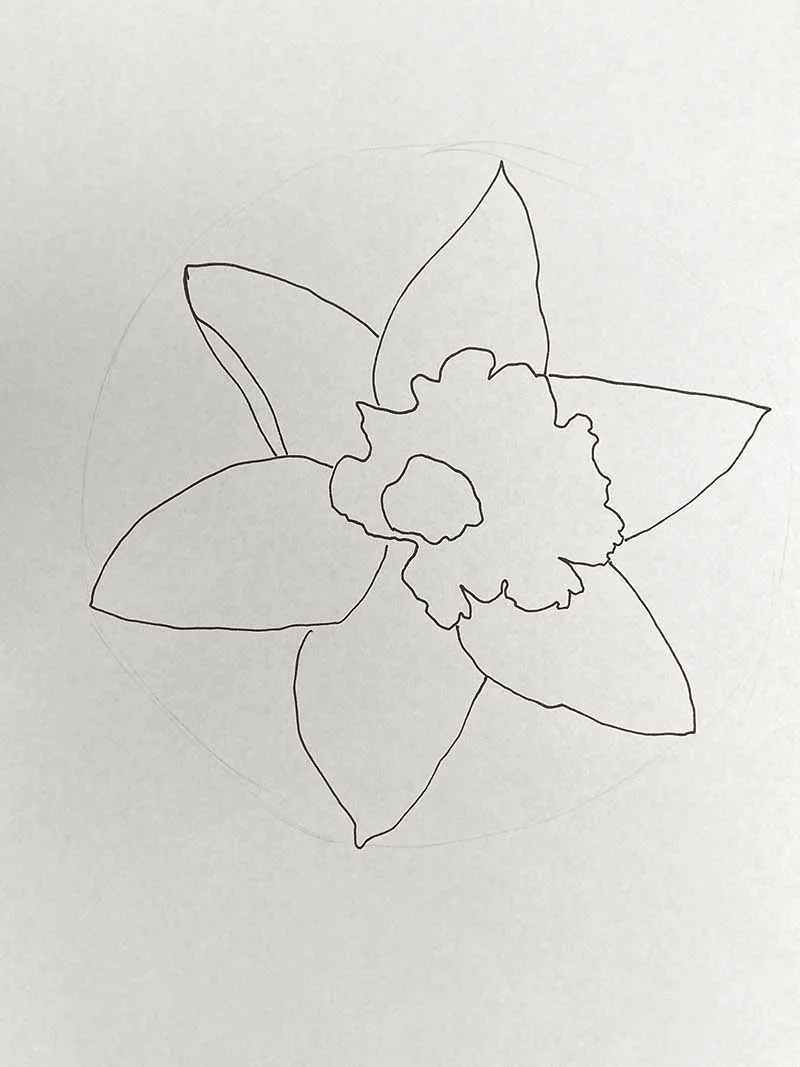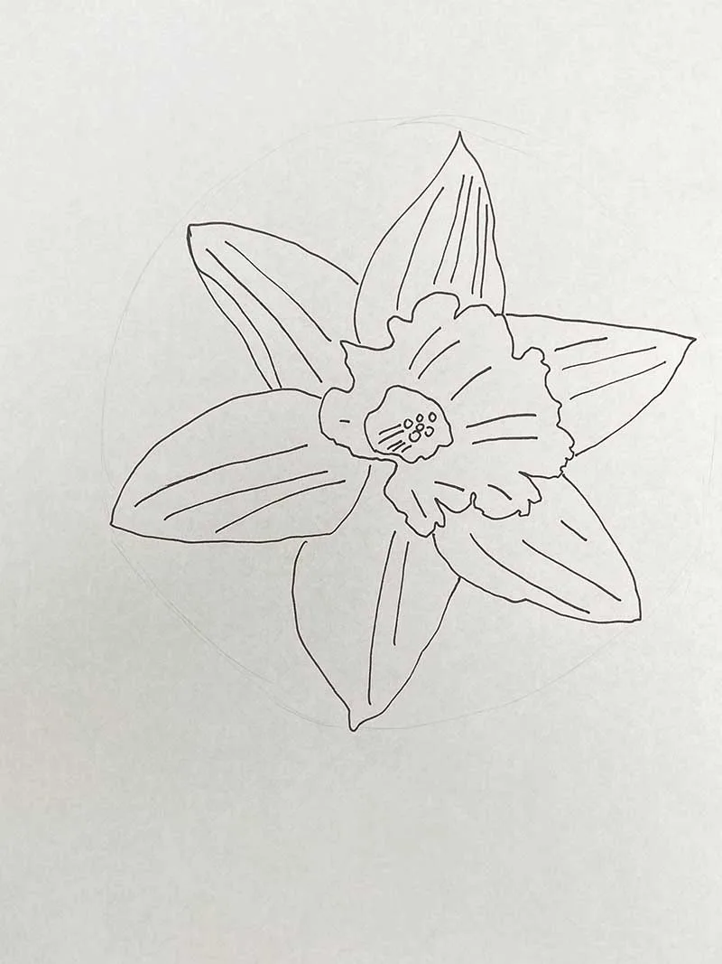 Drawing a Daffodil from a front perspective is more challenging than a side view, as it’s difficult to convey the three-dimensional corona/trumpet at the centre of the flower—this is best achieved in the colouring stage. However, I always like to start learning to draw a flower where all the petals are on view to understand its essential shape.