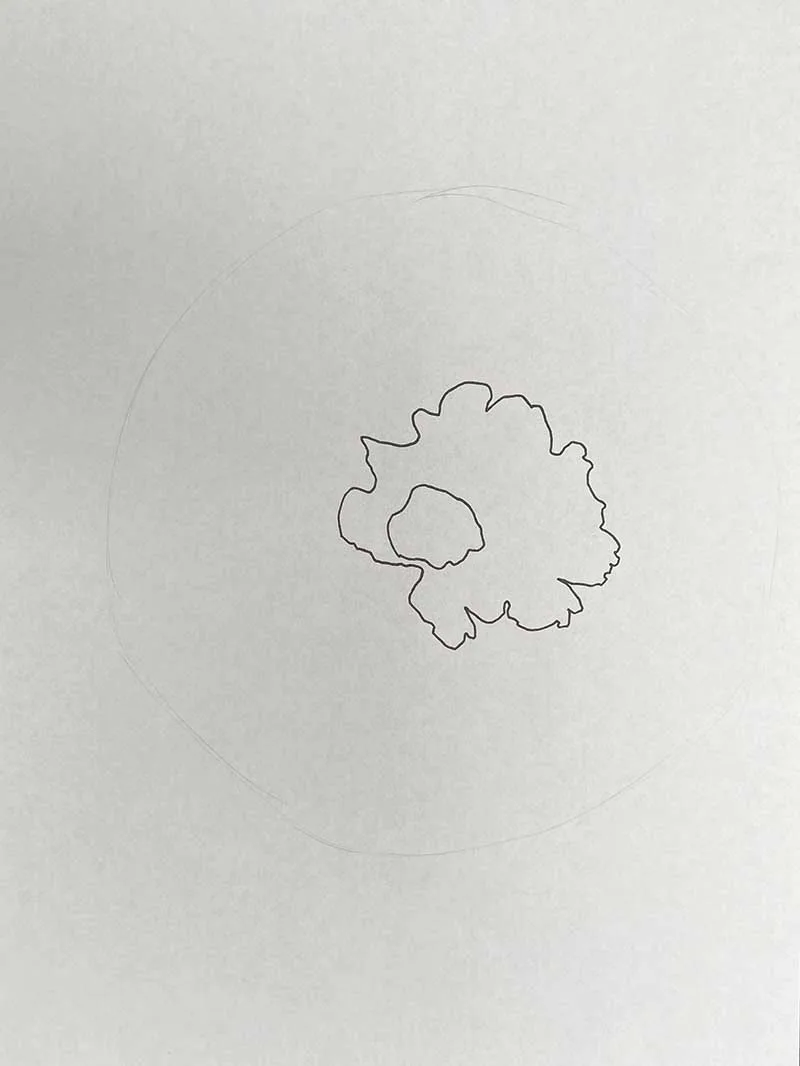 Step 1: Lightly draw an oval shape in pencil to determine the size of your flower head and guide your drawing. Then, in the centre, draw the trumpet shape of the flower’s centre.