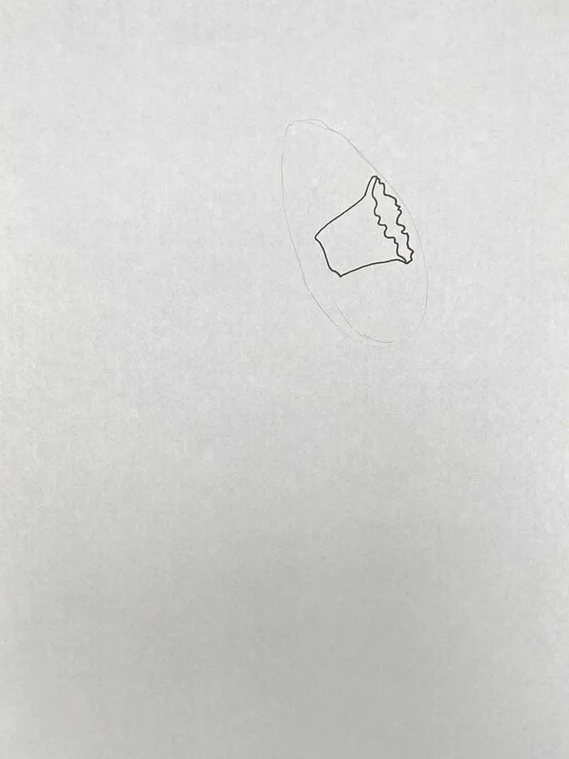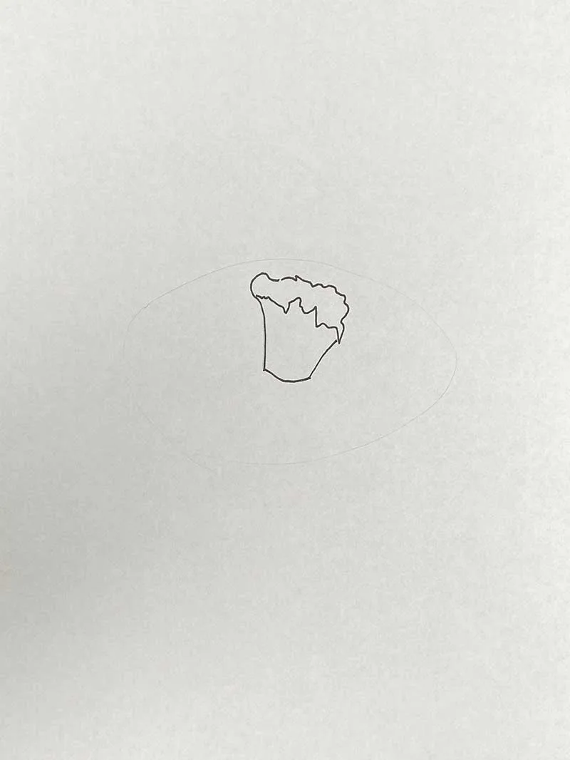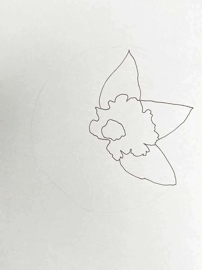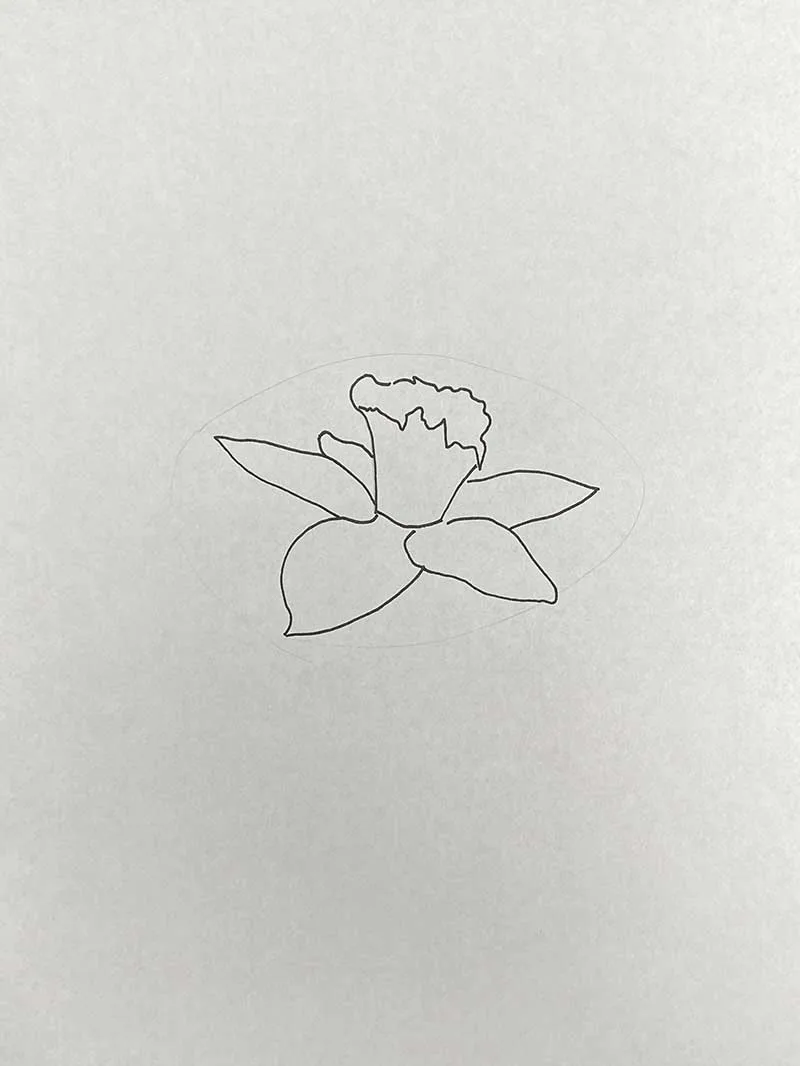 Step 1: Lightly draw an oval shape in pencil to determine the size of your flower head. Then, in the centre, draw the distinctive corona/trumpet shape. Note how wavy the top of the trumpet is.