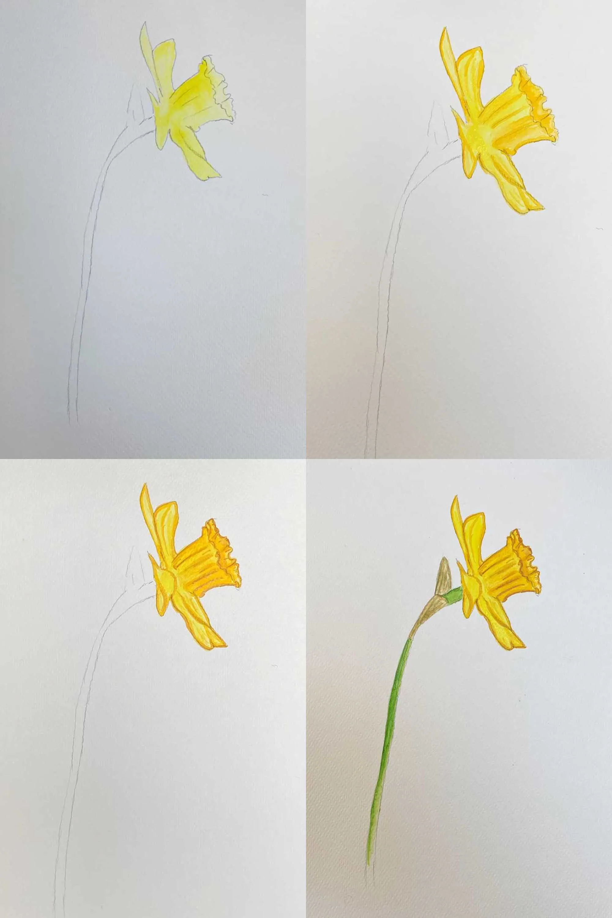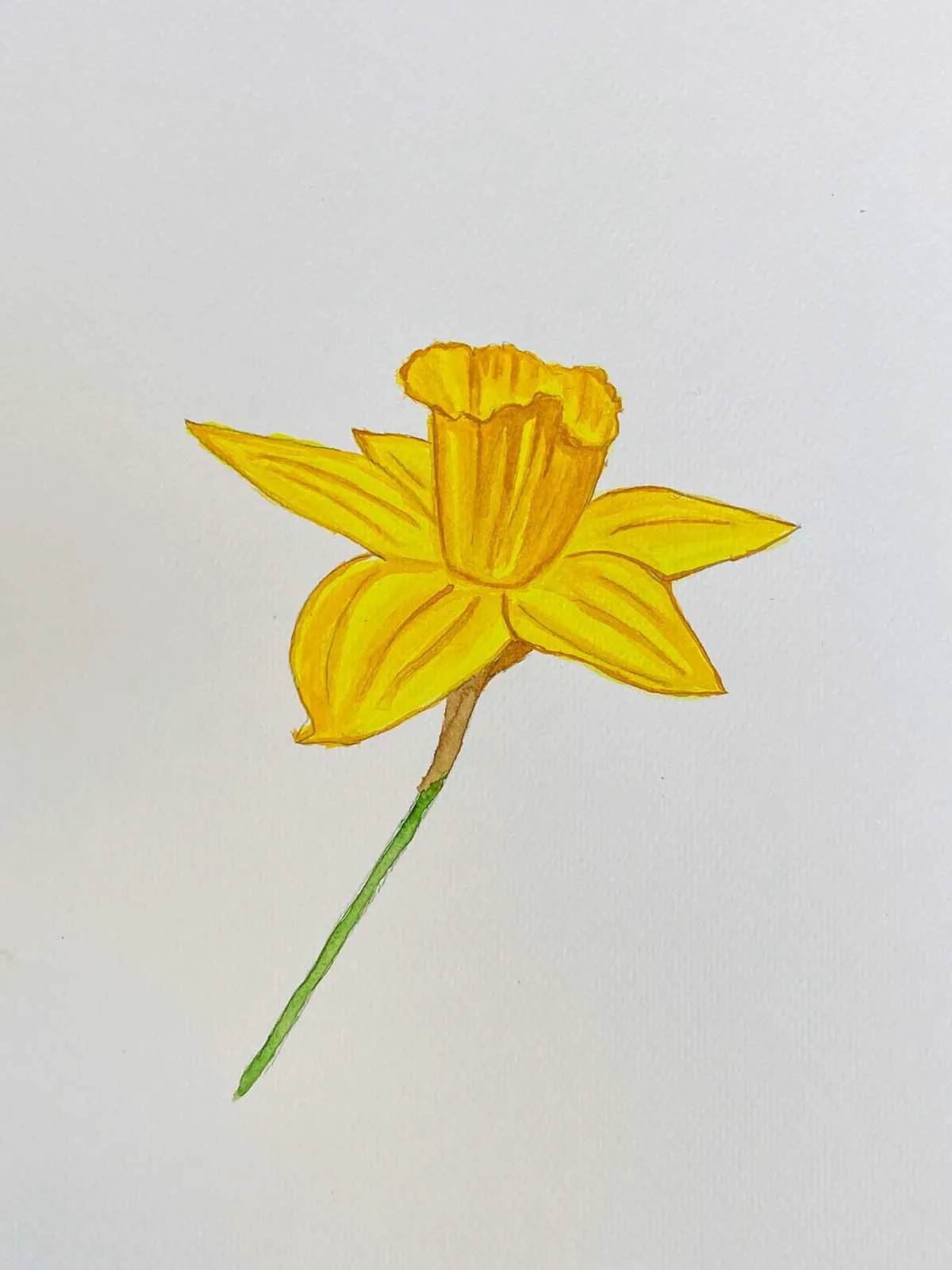 Step 4: Painting the daffodil. As in the previous tutorials, I am sticking to watercolour, and you can see how I like to layer and build up the colour.