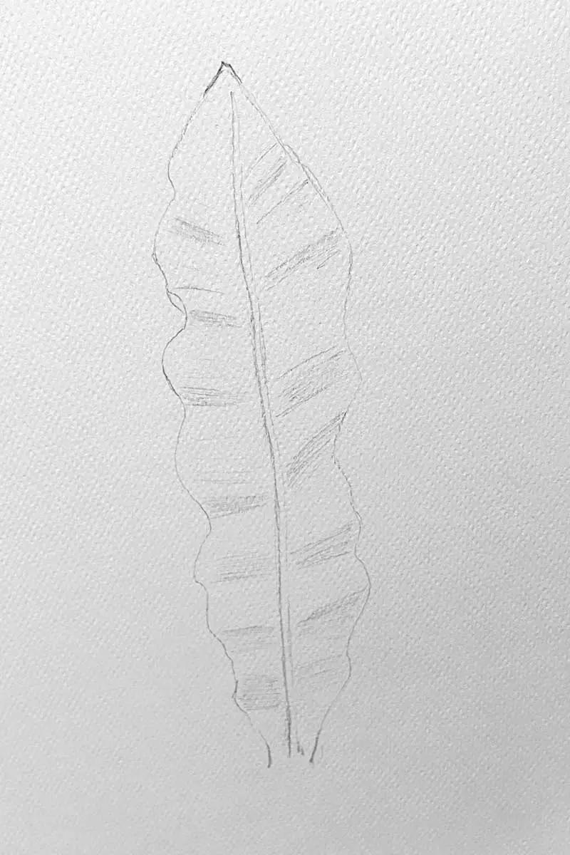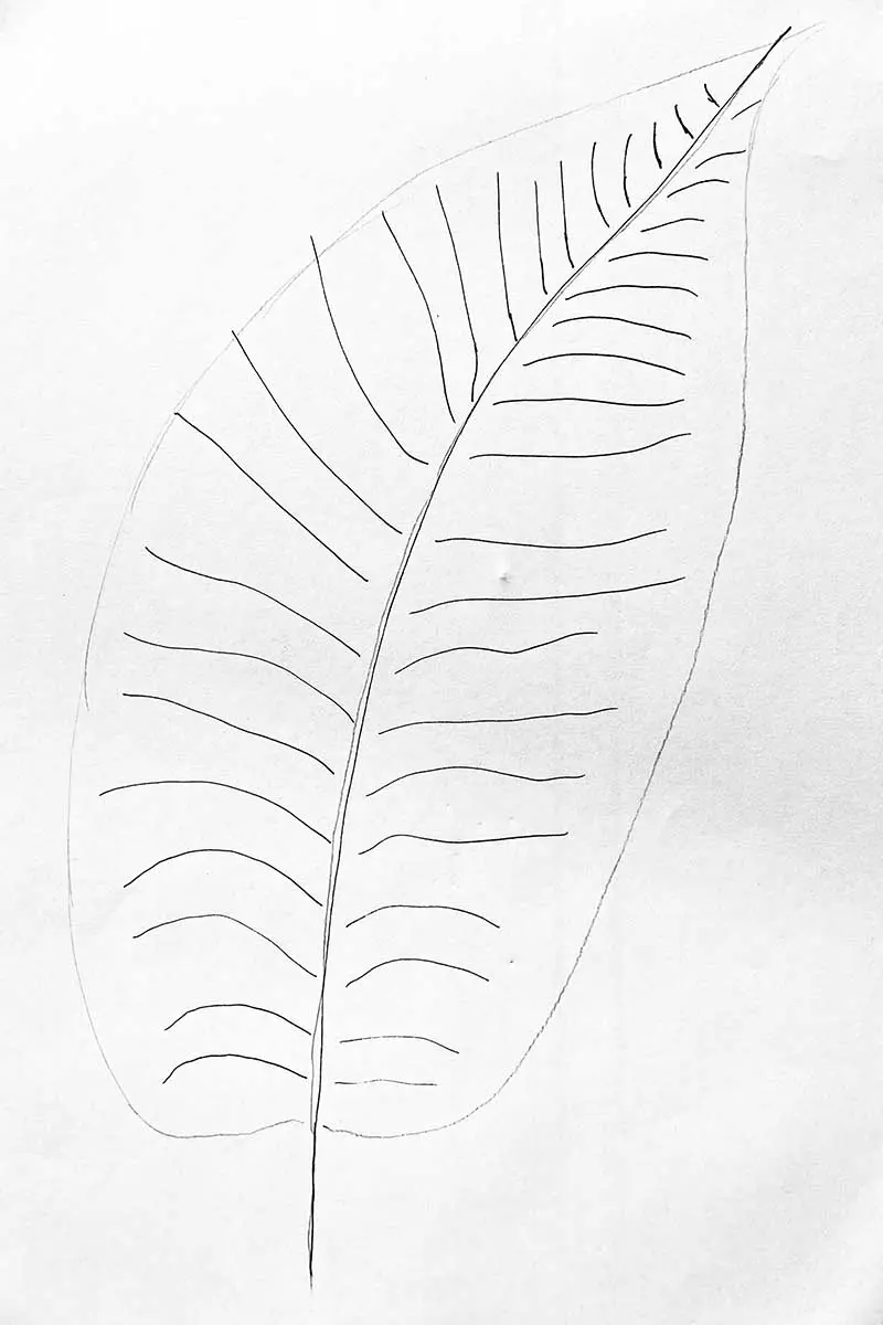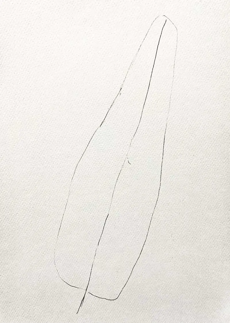 Step 1: Lightly in pencil, draw the frond shape (wide in the middle, tapered at both ends). Sketch any angles you wish, some Fronds flow from the centre, and some are more upright. Draw the stem in the centre of your frond.
