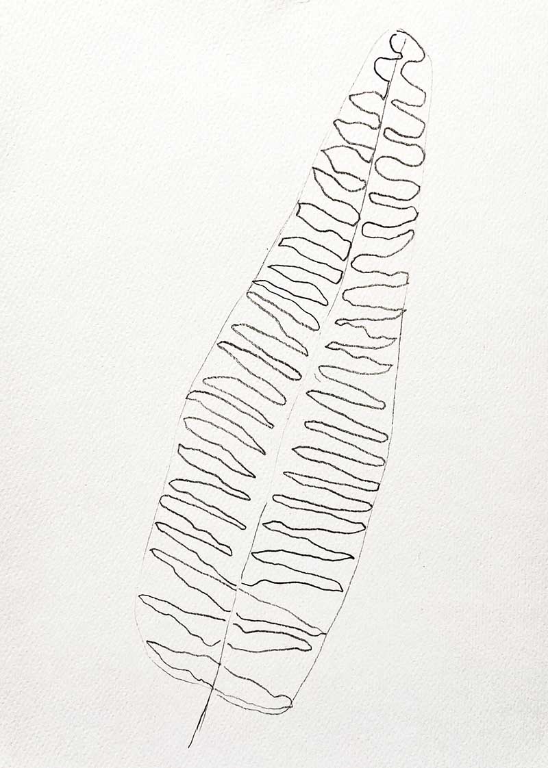 What type of fern you draw will depend on how divided your frond is and how much detail you need. For instance, a bird’s nest fern or Harts’s tongue fern is simple, and its frond is not divided. Drawing a light shape in pencil around each pinna also helps guide your drawing the same way it did for the main shape of the frond.