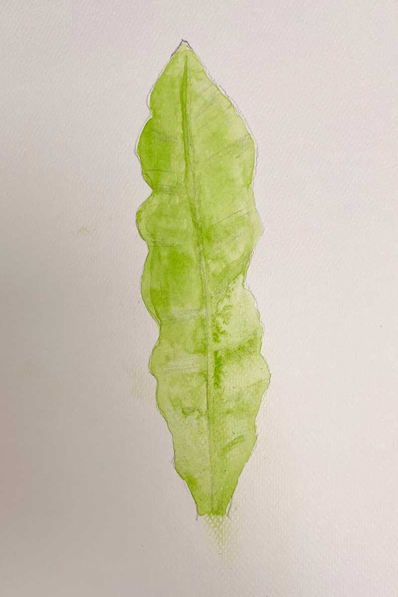Step 2: I have decided that watercolour will be the most effective way to add colour to the frond, so I have done a light green wash.