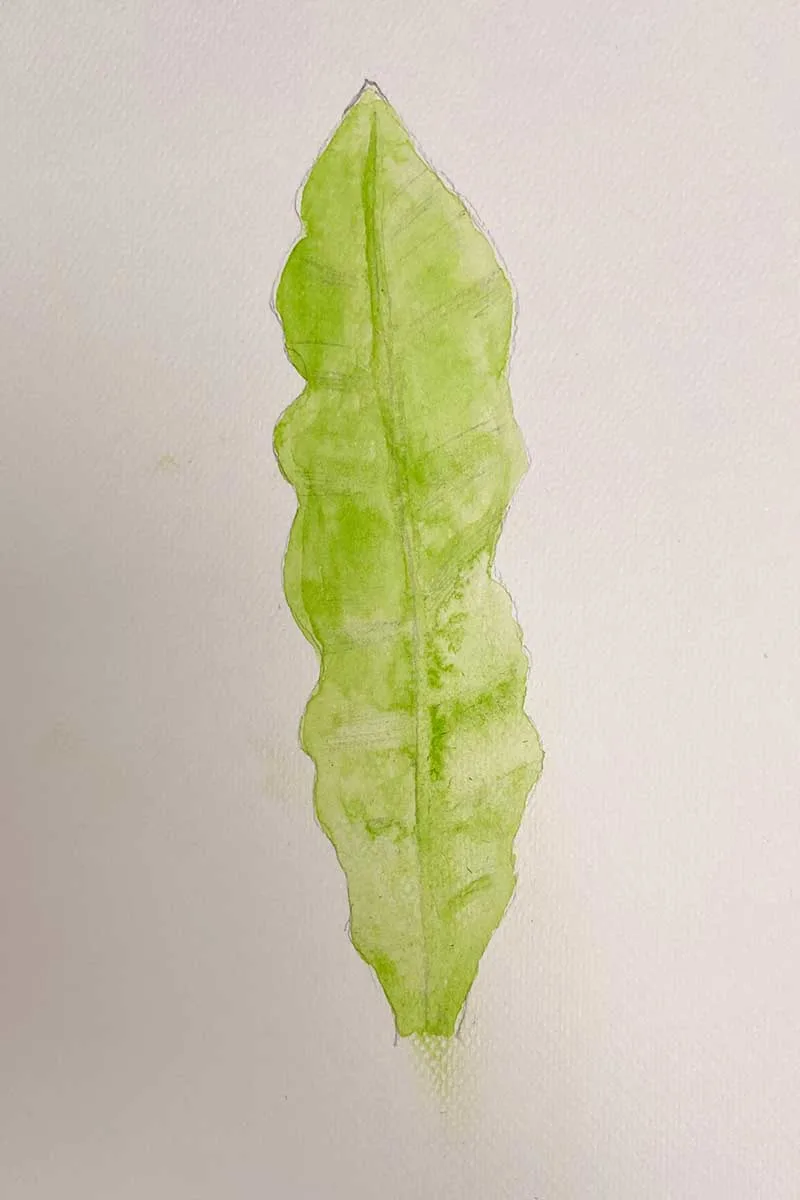 Step 3: Using watercolours, I add darker shades of green to my frond in the areas I previously shaded in pencil. These darker areas help make the image more realistic. You can see the resemblance to a banana leaf, and you could probably use the same technique when painting a banana leaf.