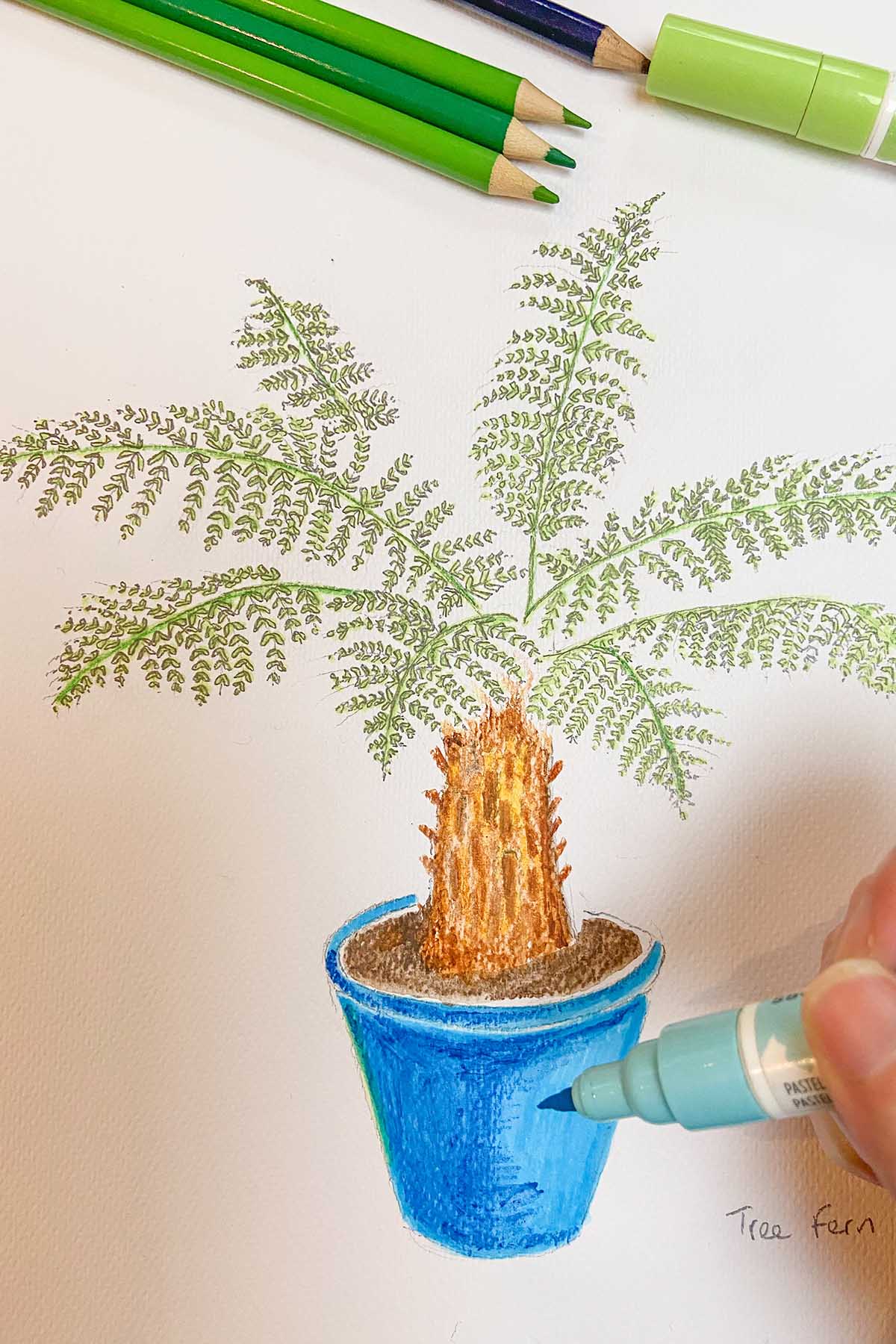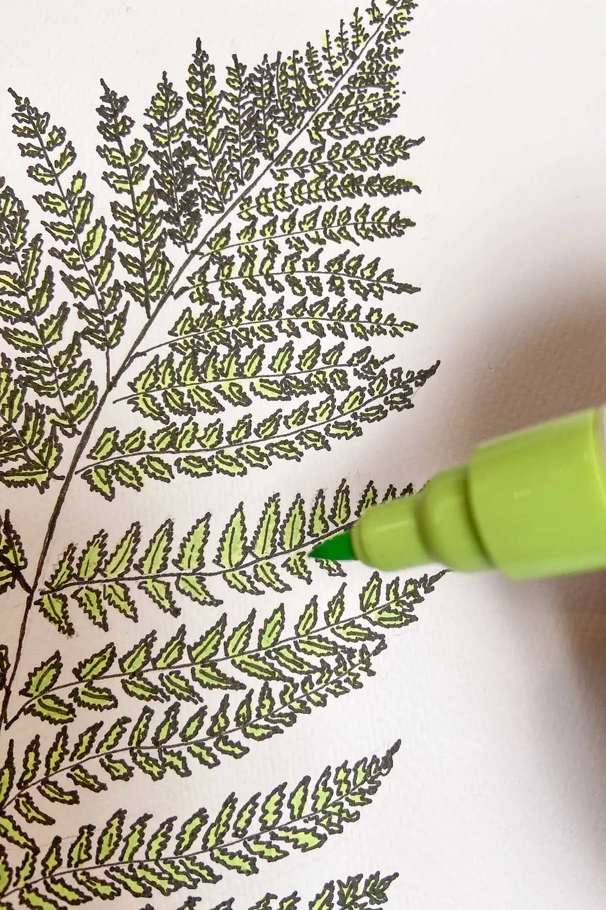 Step 5: Add colour: I like the line drawing in pen as it showed the structure of the frond, so I just used a brush pen to add some simple green colour. Coloured pencils or pens would work best, as adding paint to all the small details is tricky.