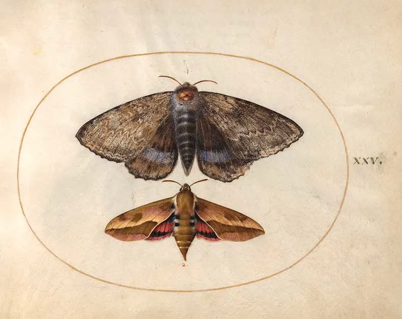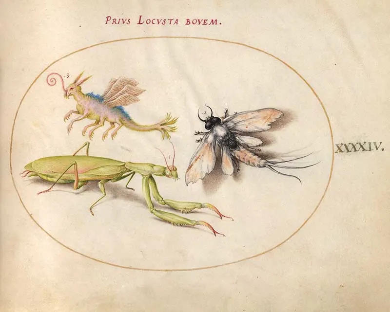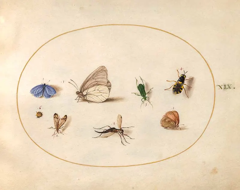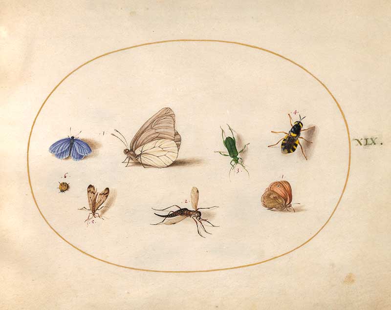 Hoefnagel did not paint all the works in the book but rather copied from other artists’ works. These included a series of drawings by the Antwerp animal painter Hans Verhagen den Stommen and woodcuts from Konrad Gessner’s Historia Animalium.