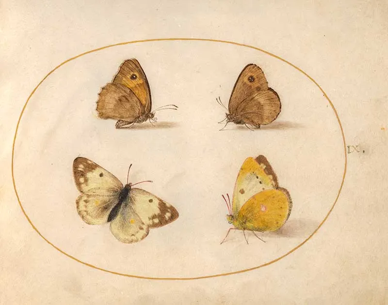 Hoefnagel’s insect illustration of four yellow butterflies.