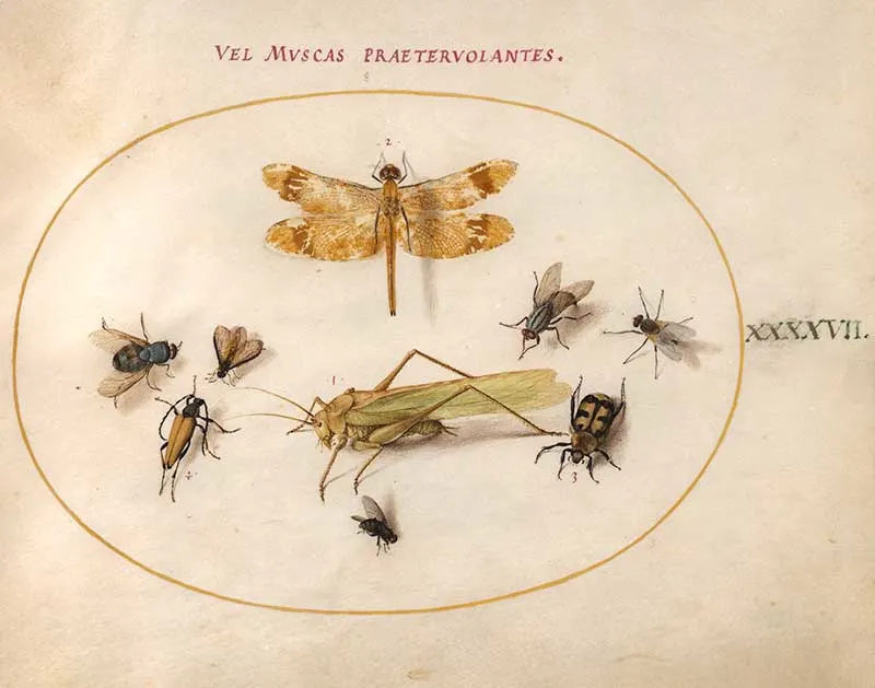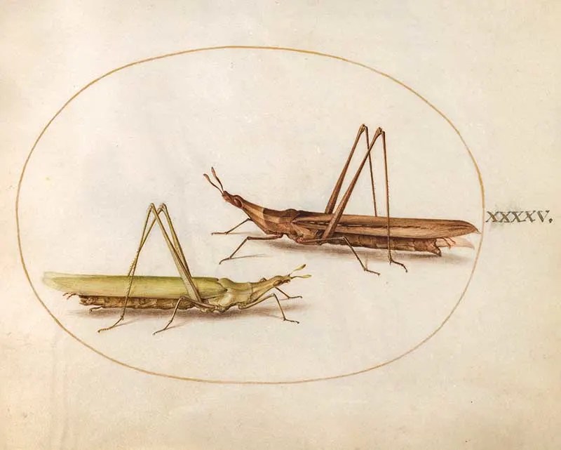 Grasshoppers are featured in art, symbolism, and literature. They were a feature in some of the Dutch Masters’ still lifes inspired by these insect paintings of Joris Hoefnagel.