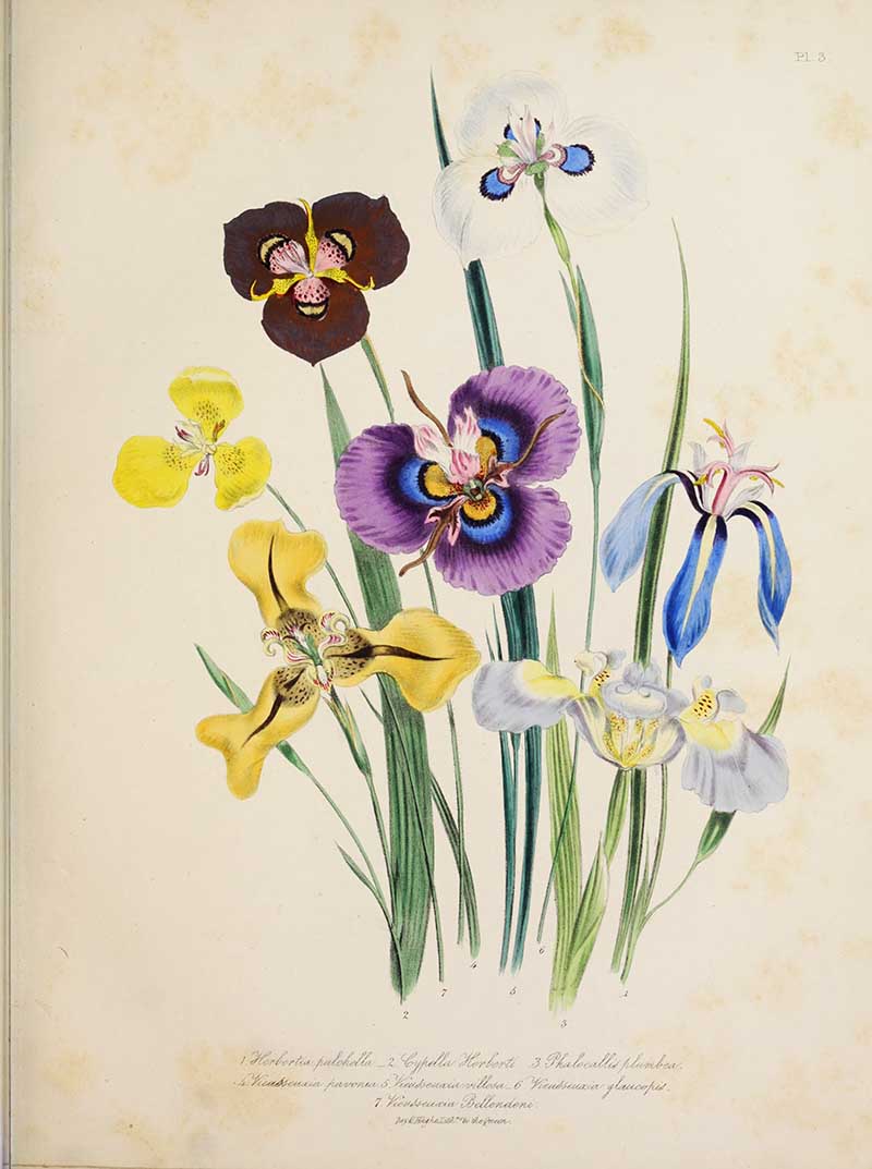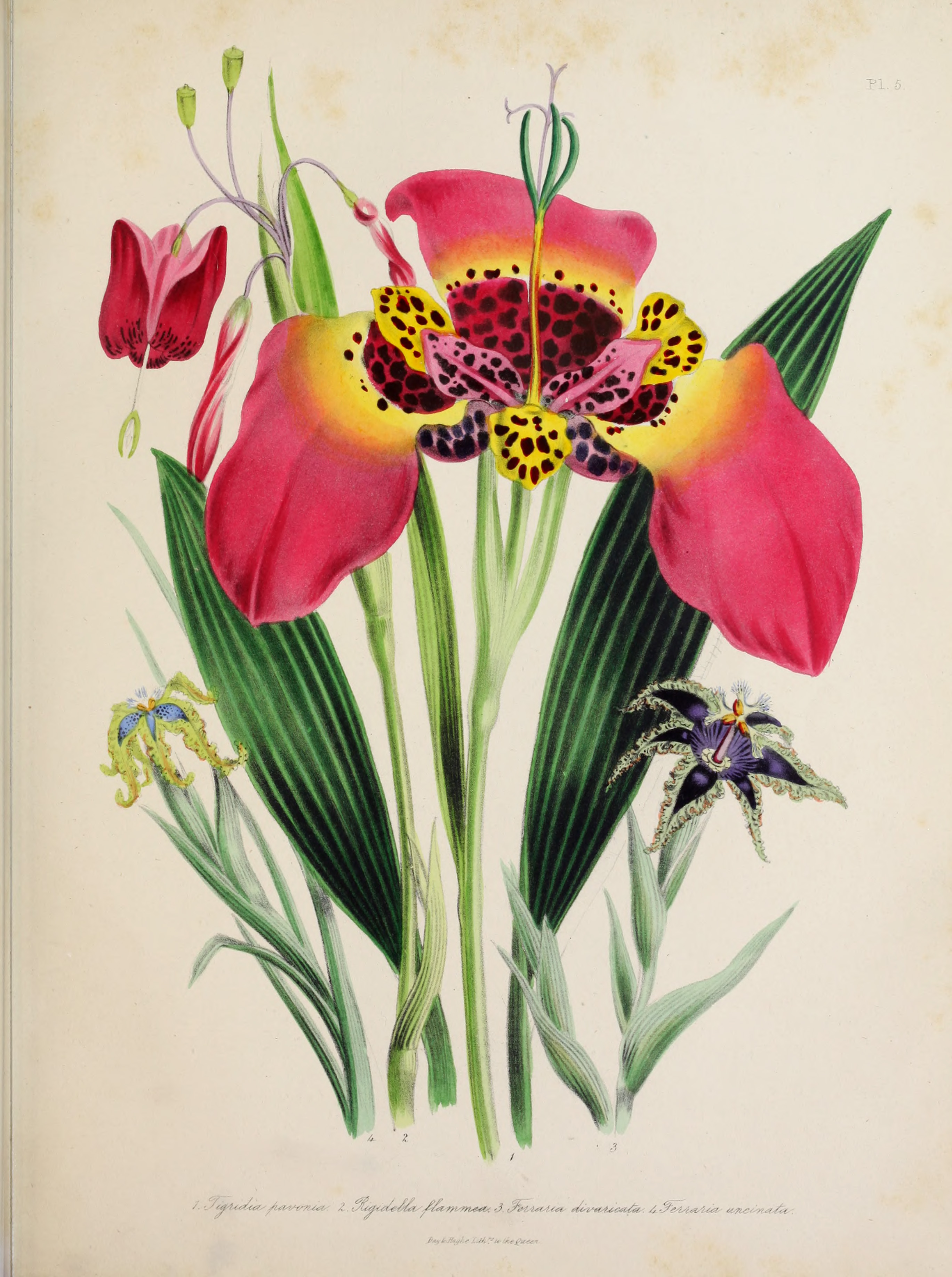 “The genus Tigridia was established by Jussieu from the tiger or rather leopard-like spotting of the flowers. The flowers are indeed very remarkable, and though they are of very short duration, never lasting more than one day, they are produced in such abundance in succession as to compensate for this defect; one plant will continue flowering for two or three months in succession, and during the whole of that time will make a splendid figure in the garden.“