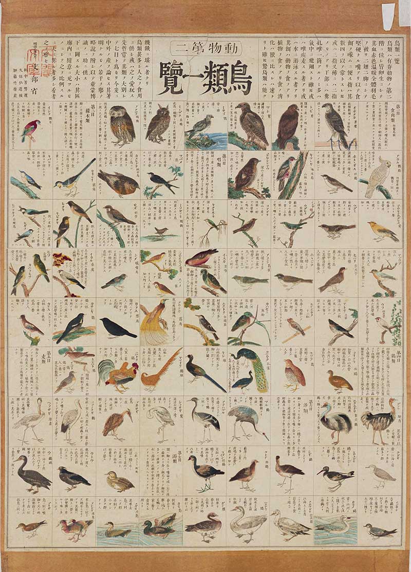 The bird chart features several Japanese bird species, each illustrated in a simple, straightforward style typical of 19th-century woodblock prints.