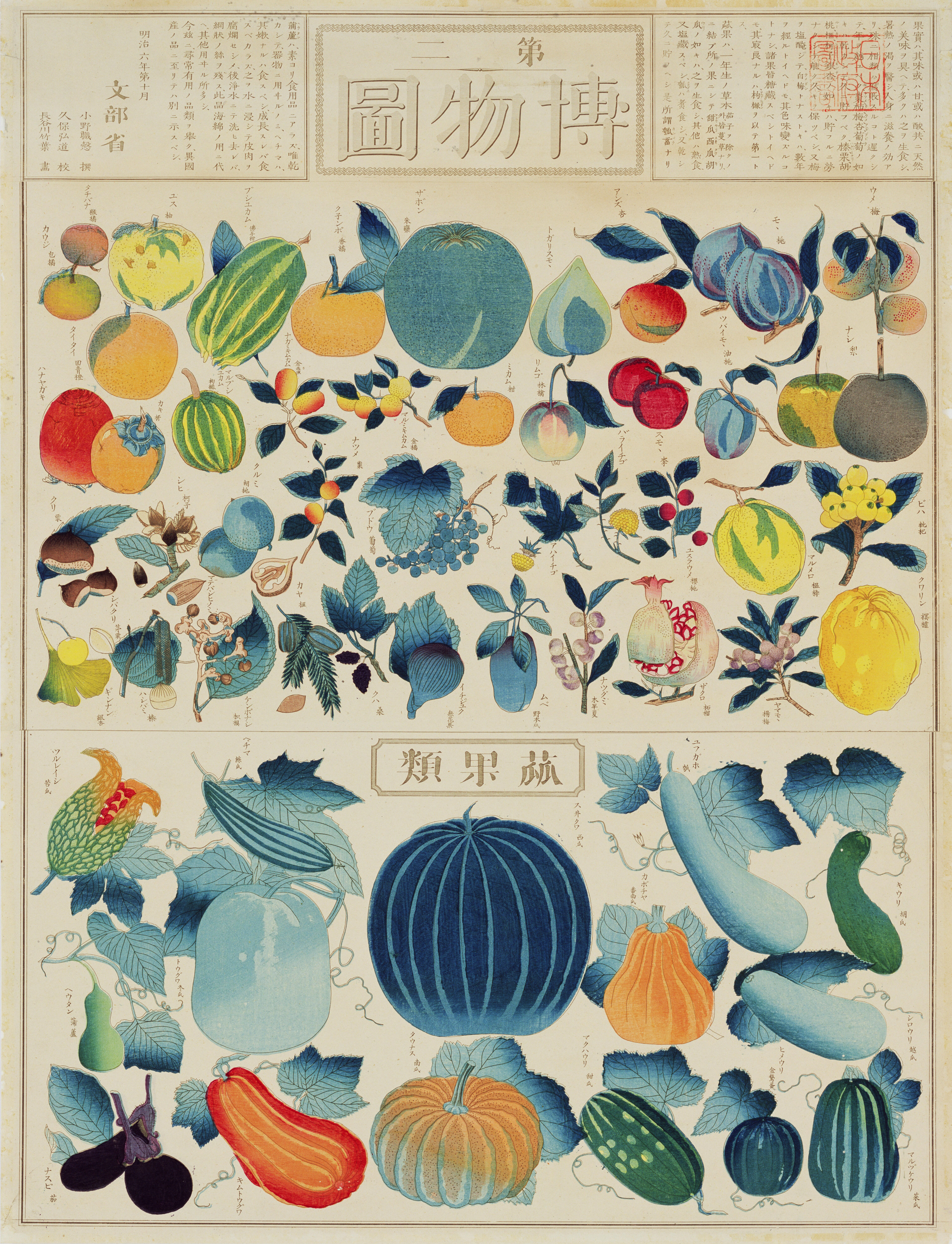 Painted by Hasegawa Chikuyo. The gourd flower family are divided into groups. Fruits such as peach, plum, and persimmon are drawn in the upper section, and pumpkin, eggplant, and gourd are drawn in the lower section, both with multicoloured paints.