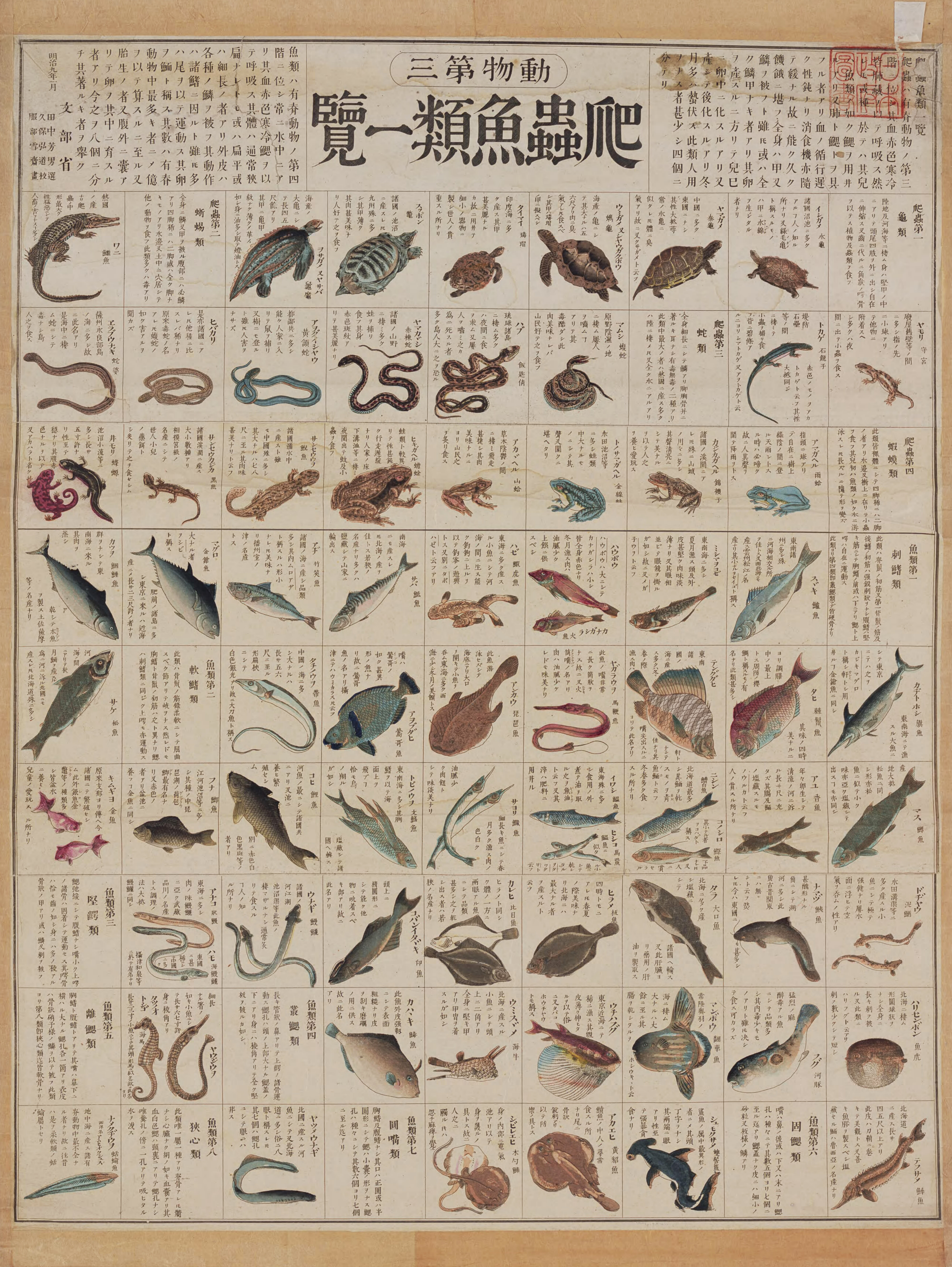 Vintage Japanese educational animal chart featuring reptiles, amphibians and fish.
